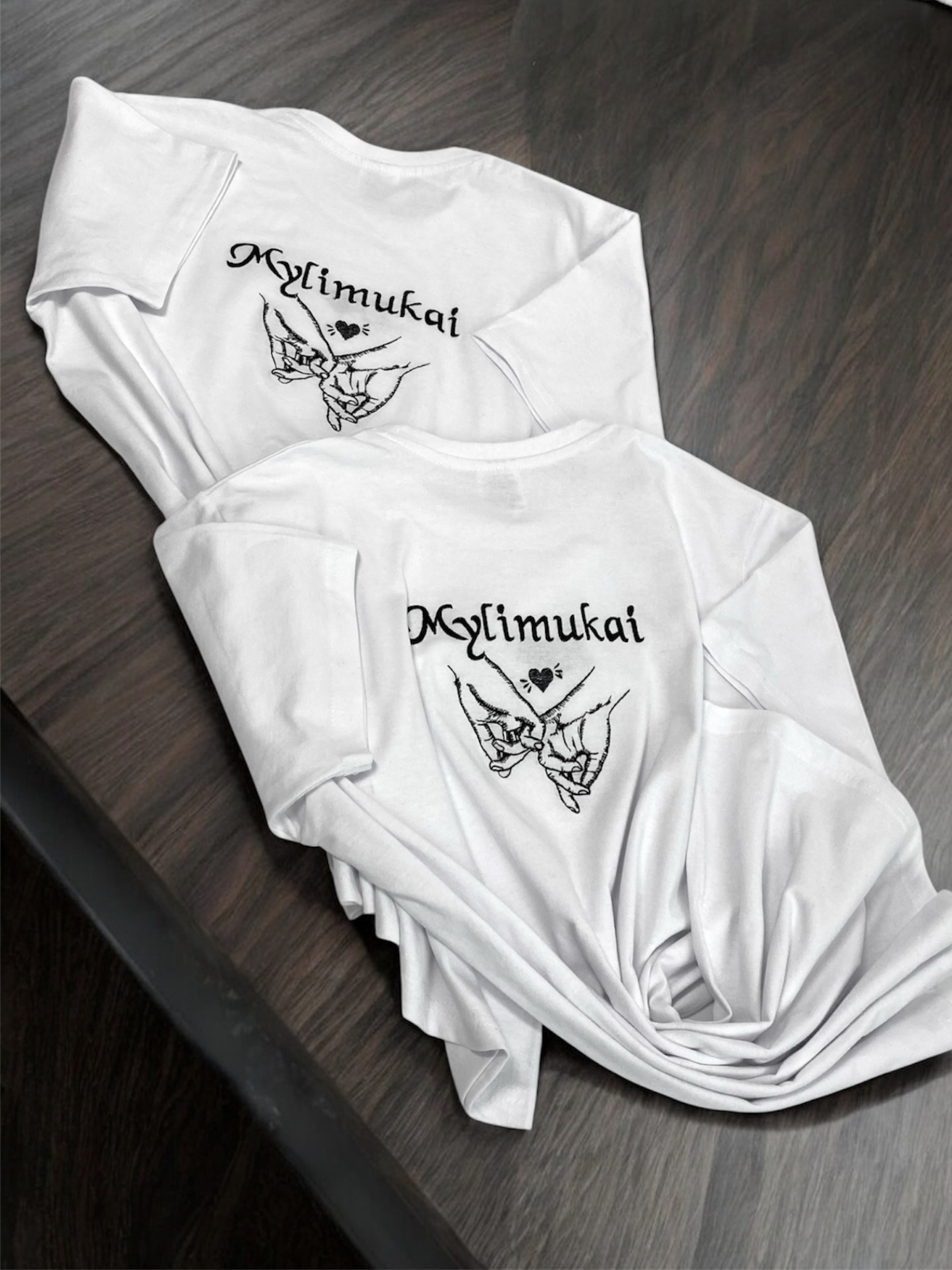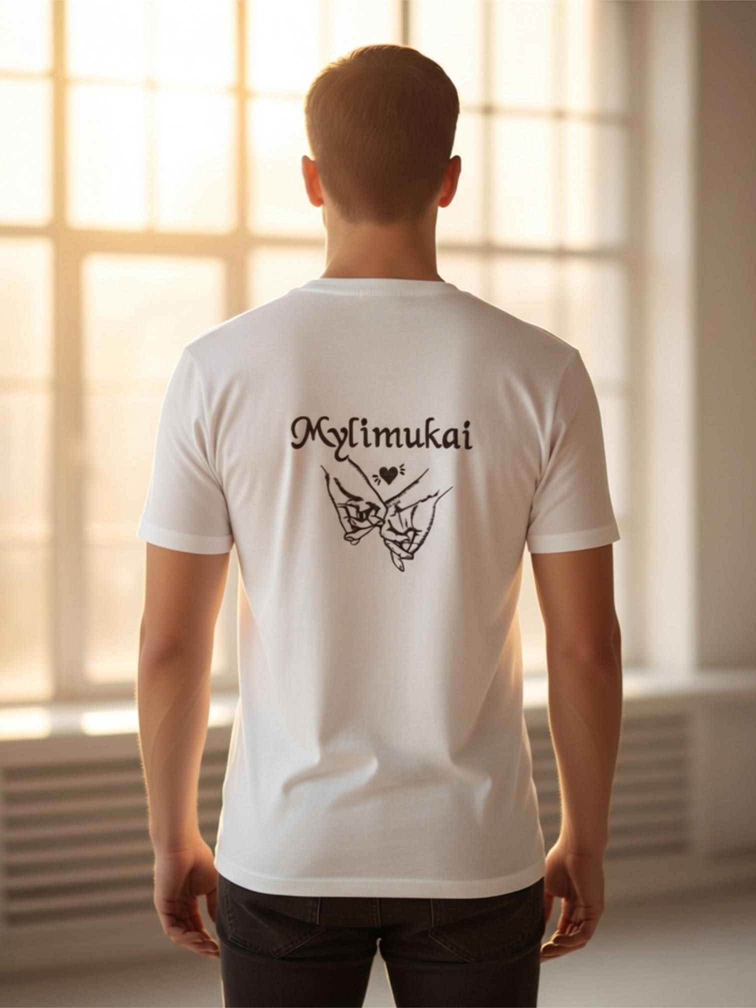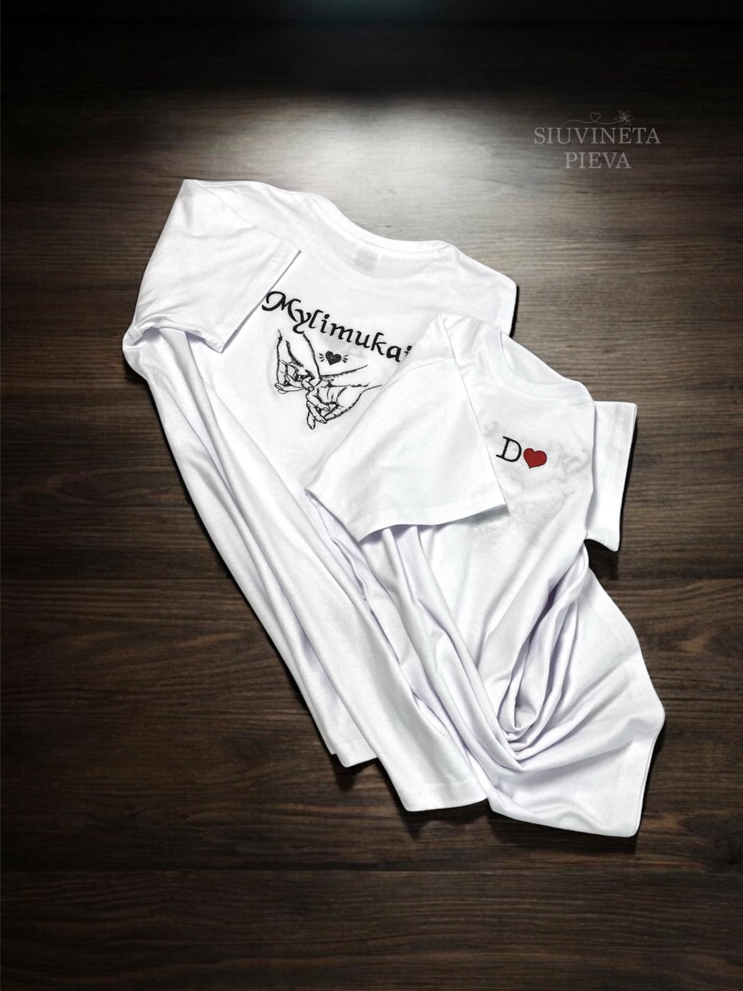 Aukštos kokybės, siuvinėti marškinėliai trumpomis rankovėmis, su užrašu "Mylimukai” ir rankyčių su širdele dizainu.