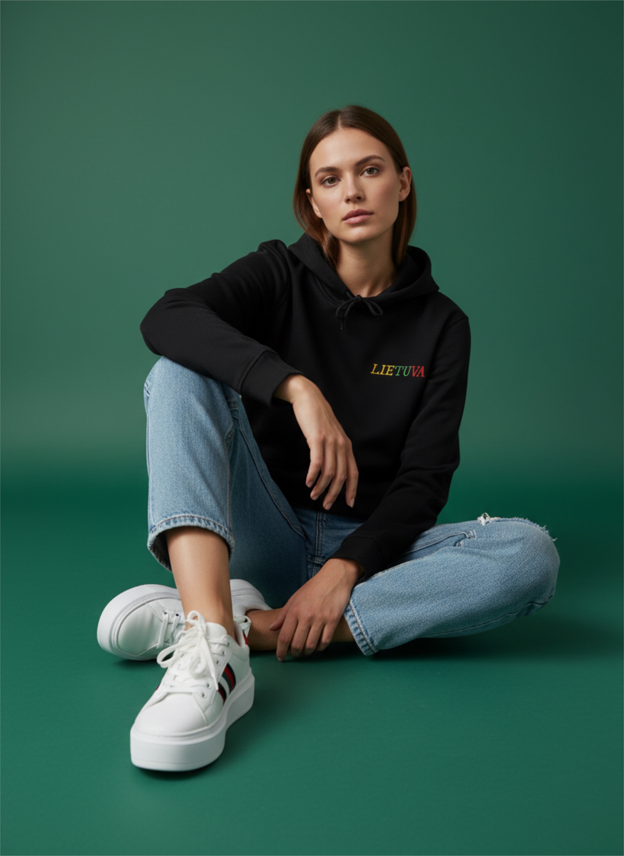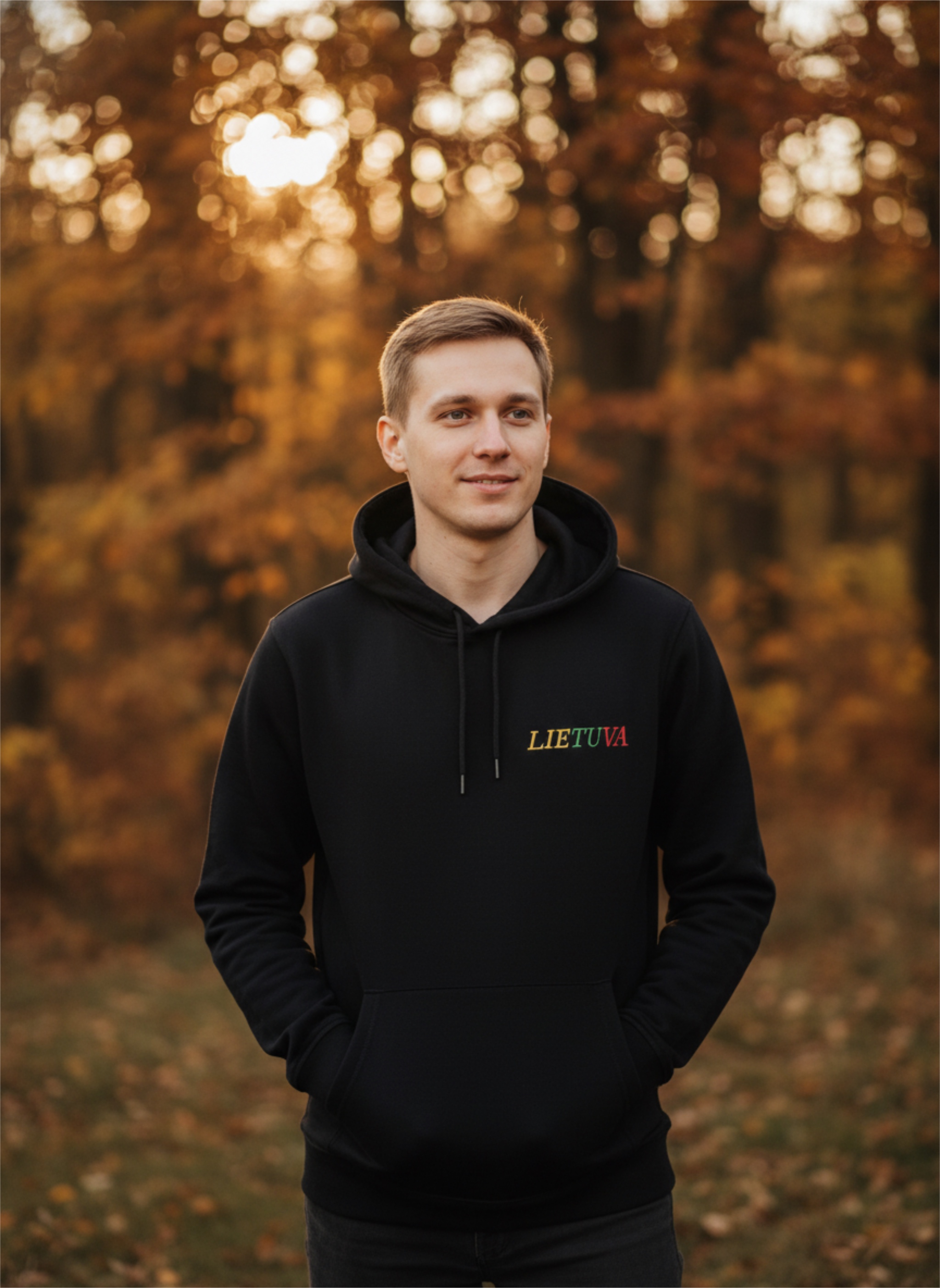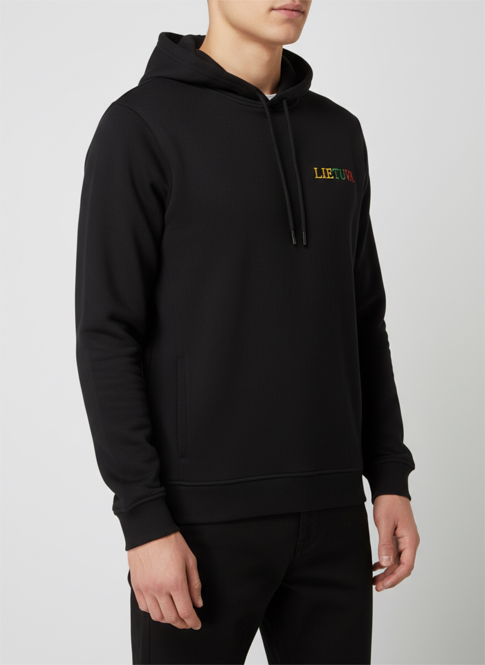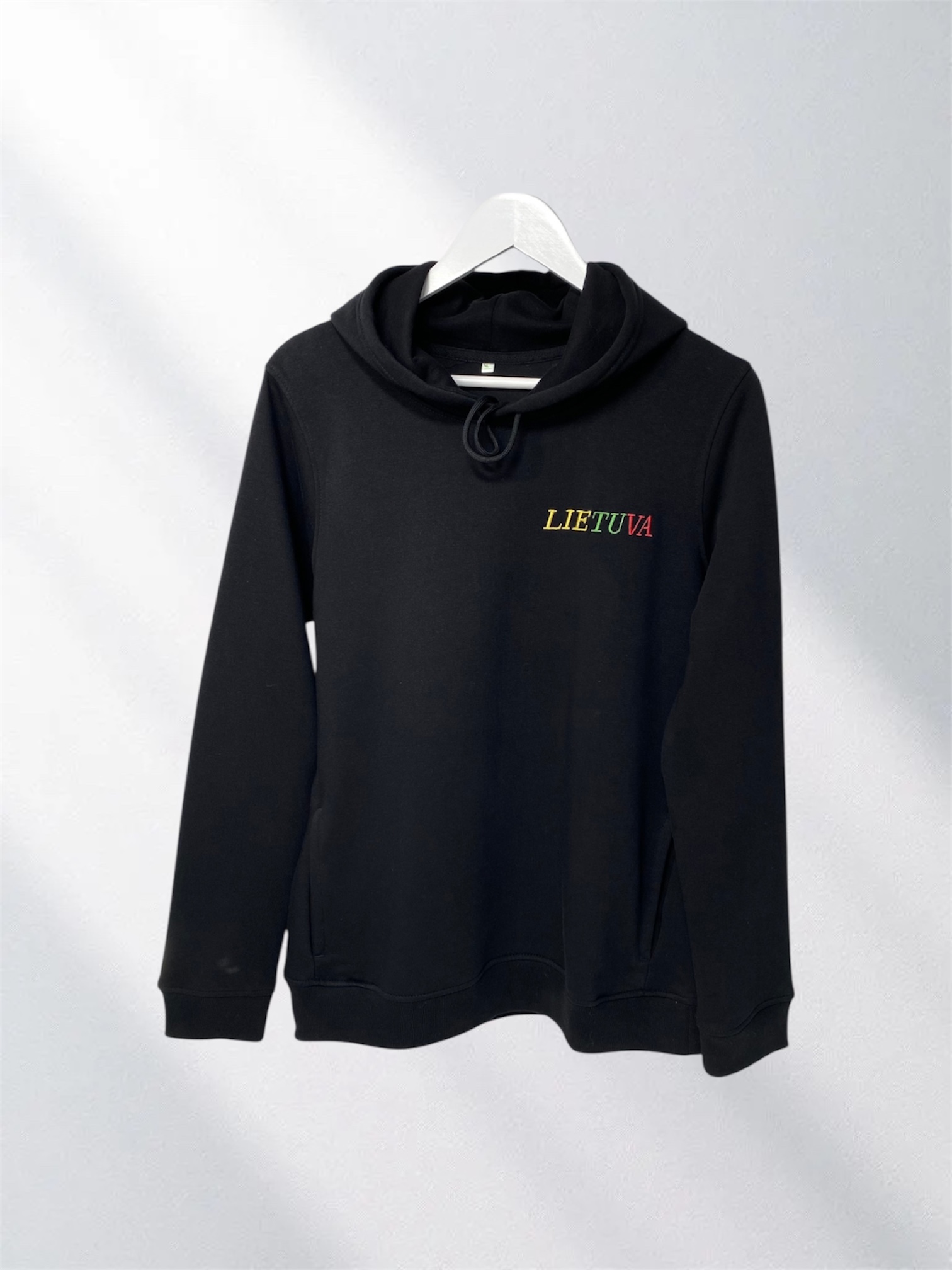 Juodos spalvos, aukštos kokybės džemperis su gobtuvu, išsiuvinėtas tekstu ''Lietuva'', Lietuvos trispalvės spalvomis. Universalus, tinka tiek vyrams, tiek moterims.