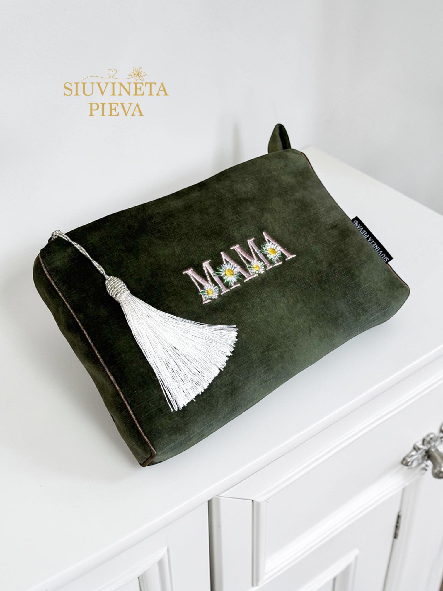Rankų darbo, žaisminga ir nuotaikinga samanų spalvos, tvirto veliūro kosmetinė, išsiuvinėta žodžiu "Mama", su ramunių žiedais. Dekoruota kutu. Puikiai tiks kiekvienai mamai., bet kuria proga - gimtadienio, mamų dienos, ar šiaip be progos pamaloninti.