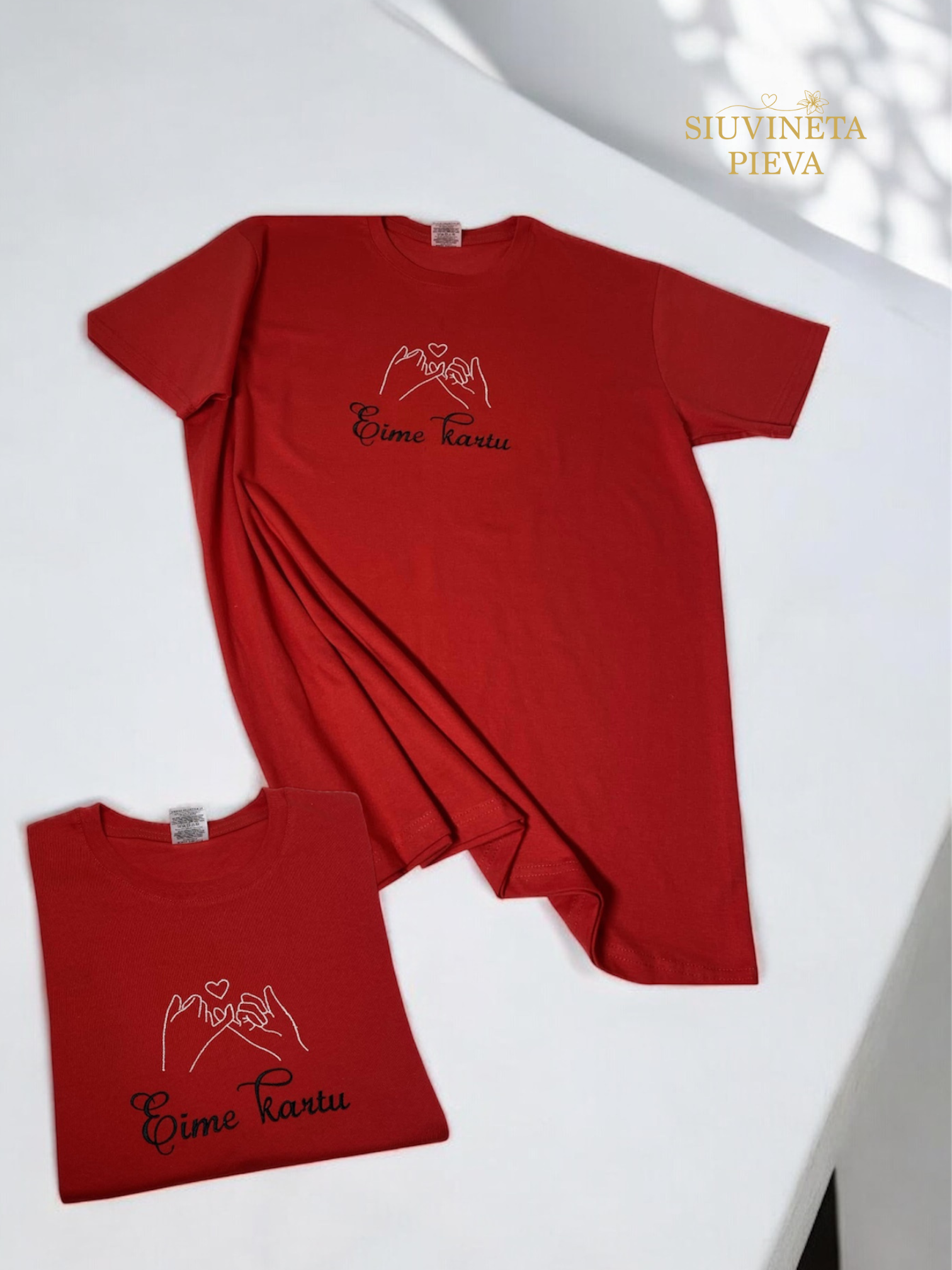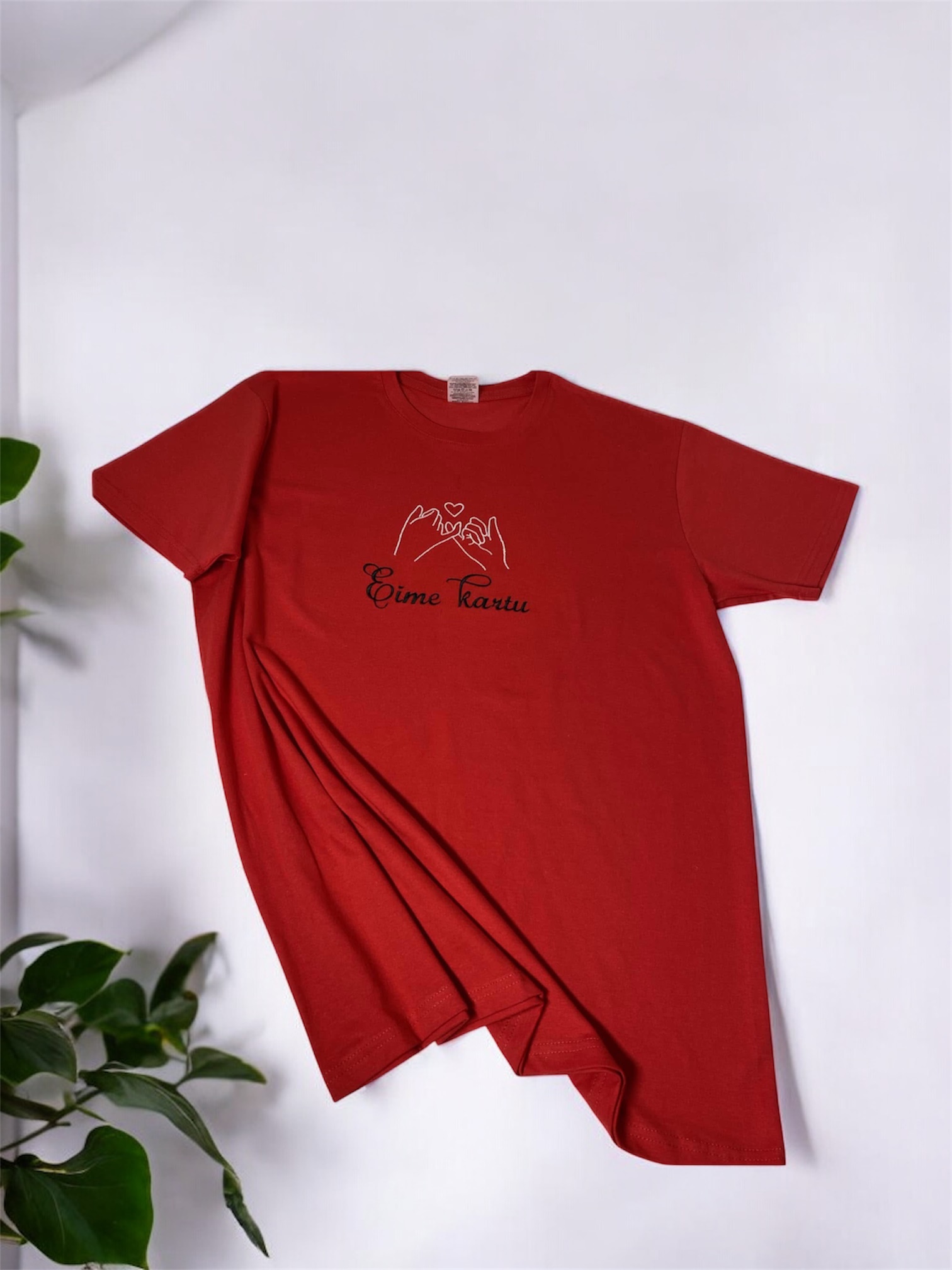 Aukštos kokybės, siuvinėti raudoni marškinėliai, trumpomis rankovėmis, su išsiuvinėtu tekstu ir rankų su širdele dizainu.