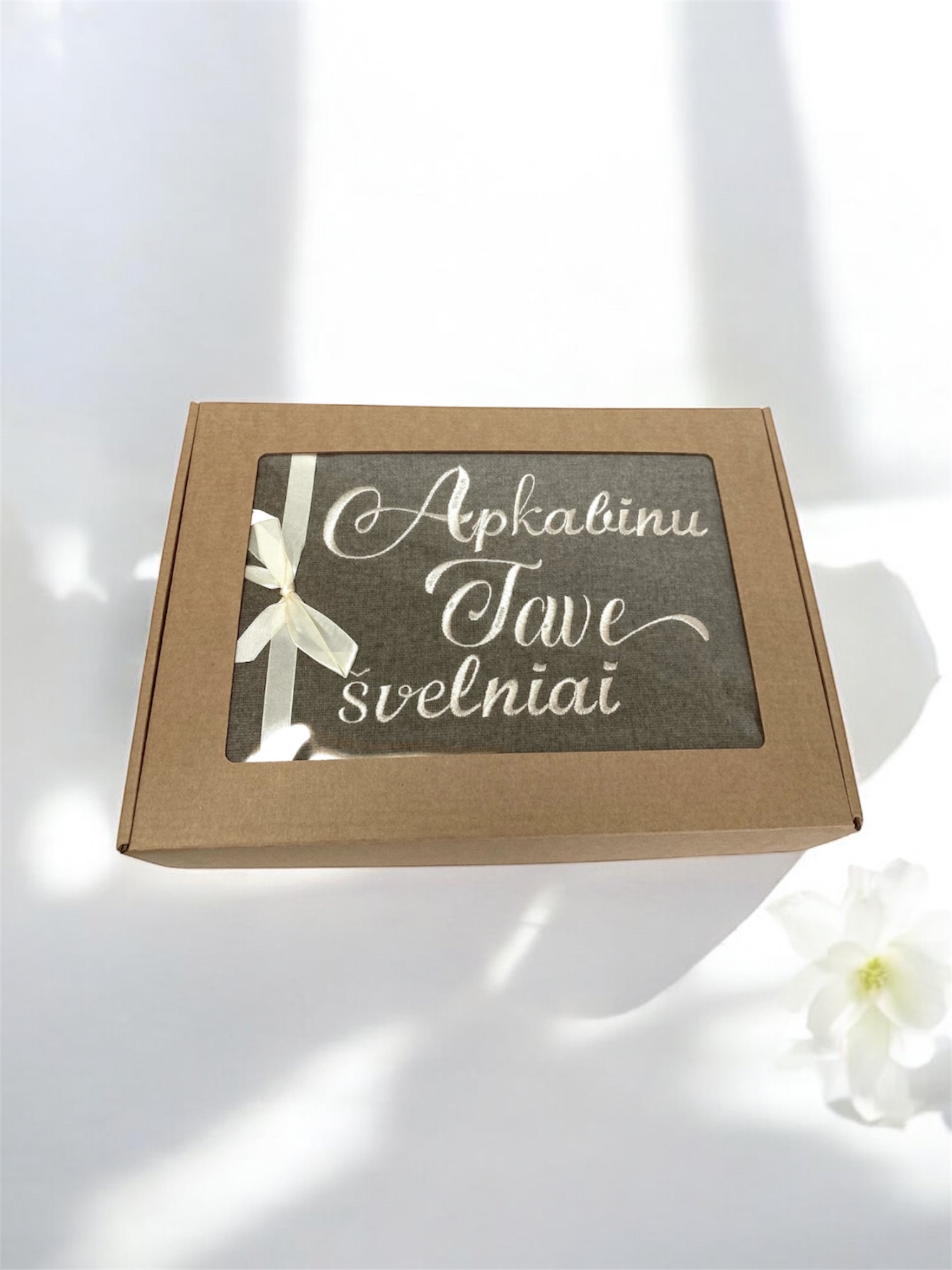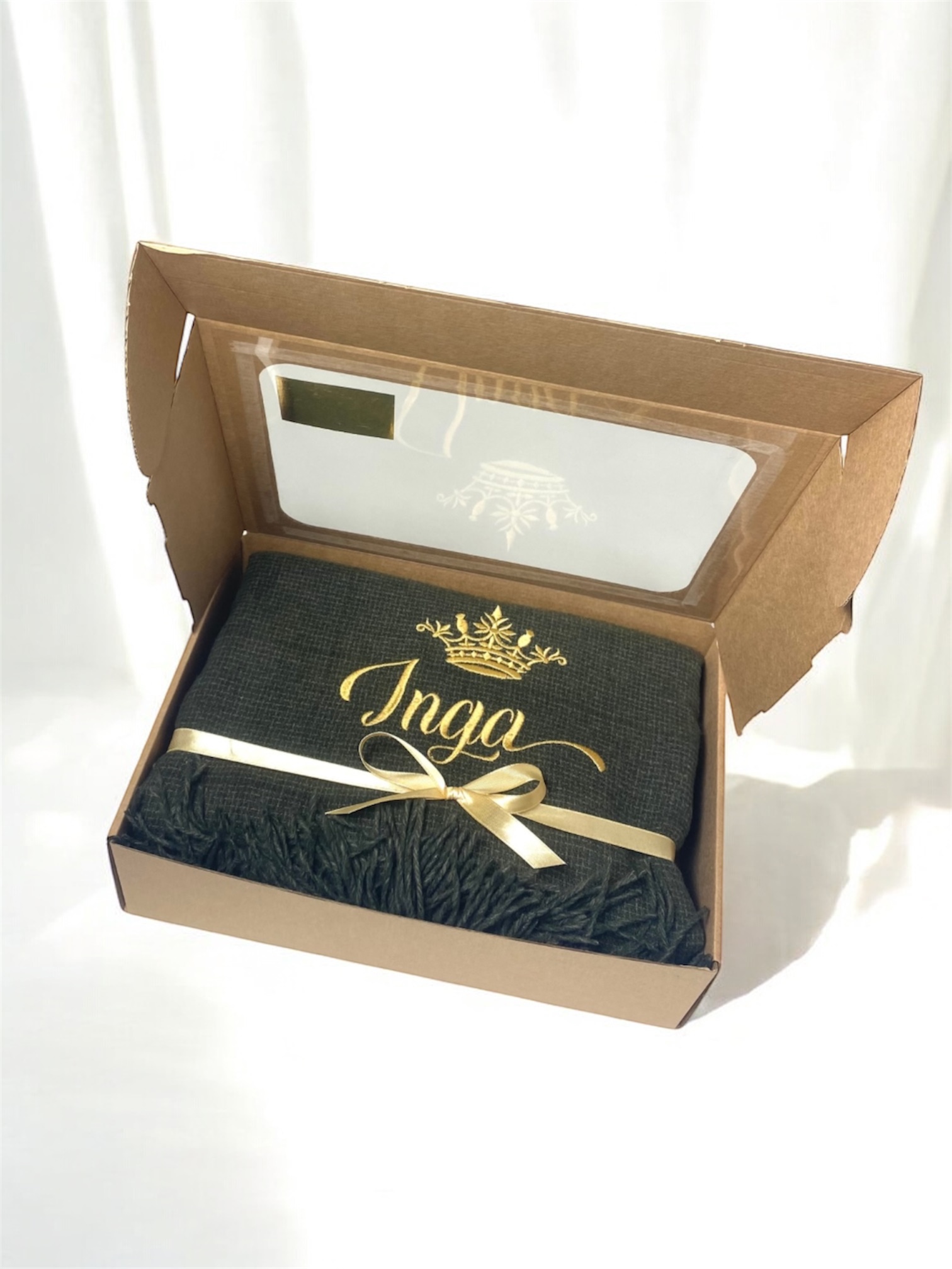 Dovanų dėžutė su langeliu - pledui. Išsiuvinėtą pledą supakuosime į dovanų dėžutę. Bus galima dovanoti iškart - be rūpesčių.
