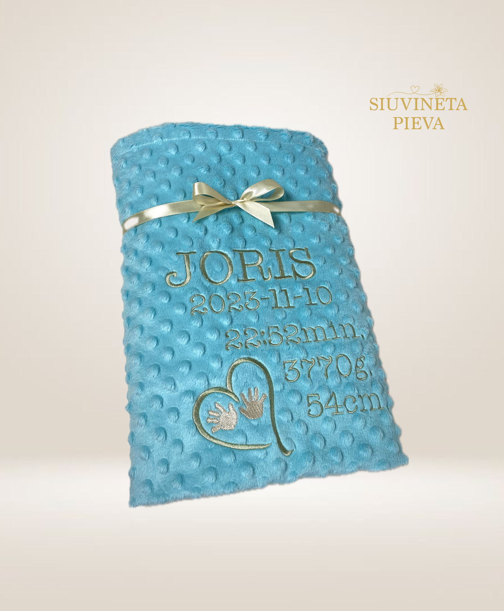 Rankų darbo pledukas - mielas ir jaukus, siuvinėtas vaiko metriku.
