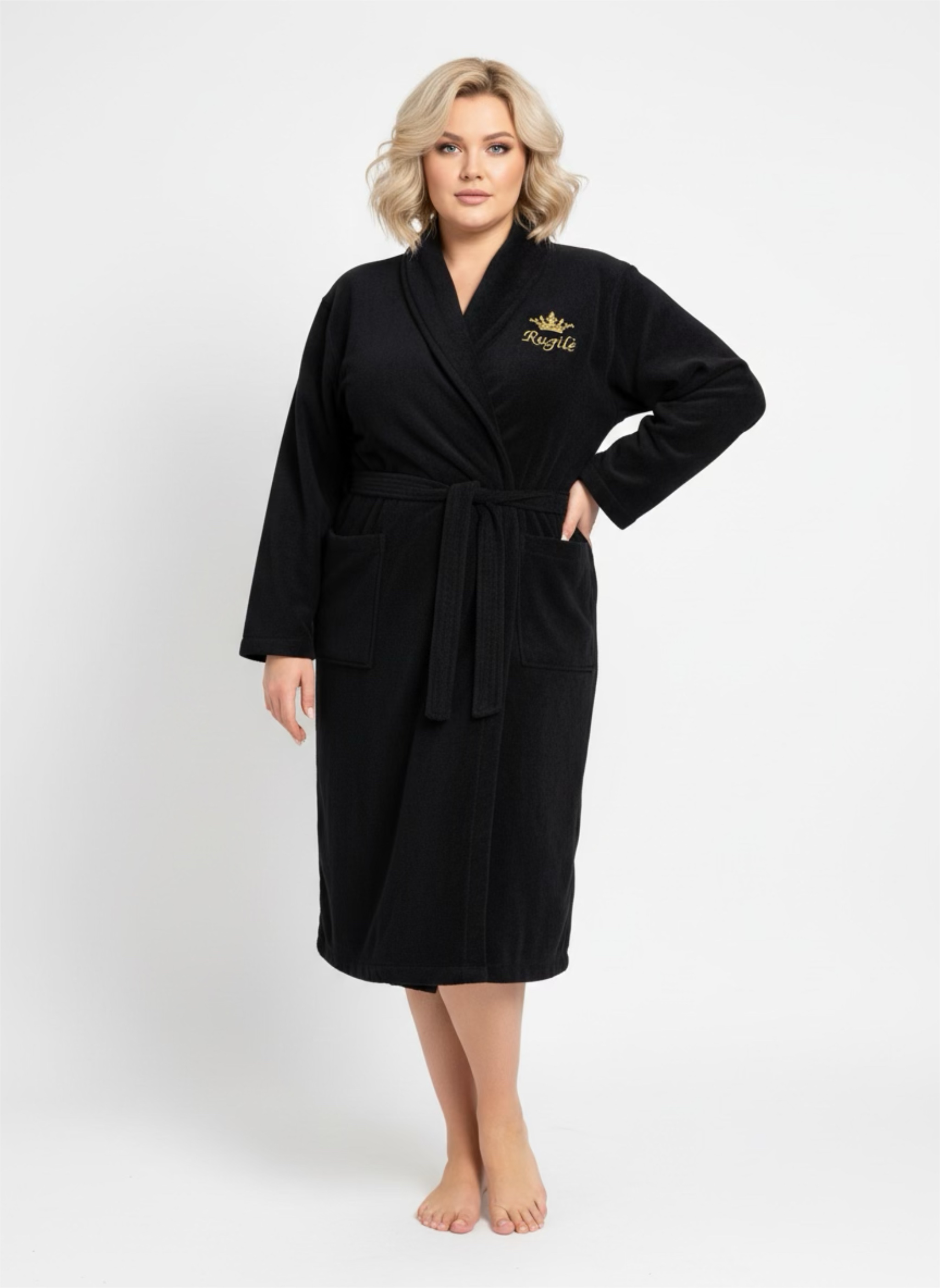 Plati apykaklė - privalumas nemėgstantiems gobtuvo. Dvi patogios kišenės. Chalatas susiaučiamas diržu.
