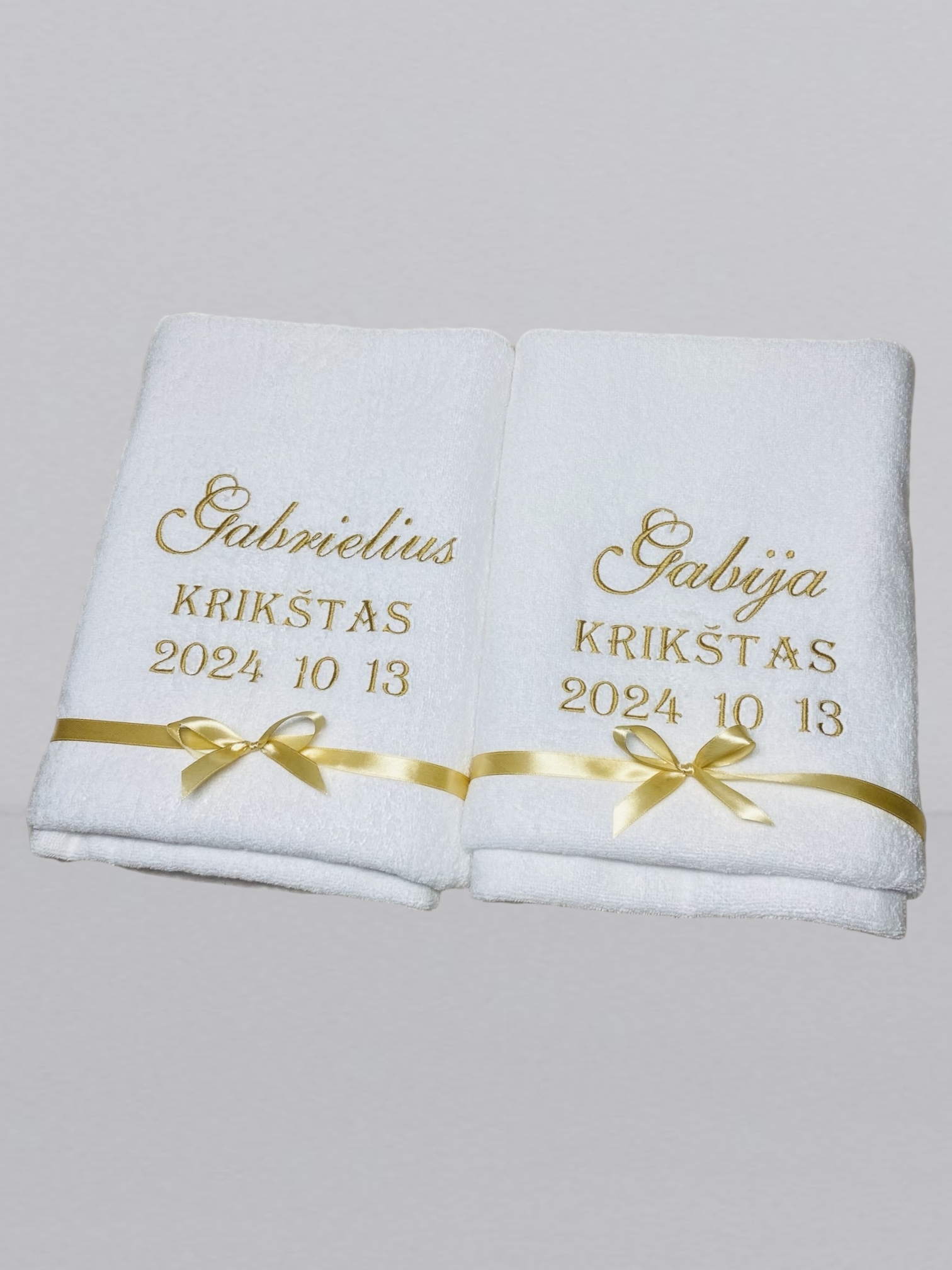 Vonios rankšluosčiai, krikštynų proga, su išsiuvinėta krikšto data ir vardu.
