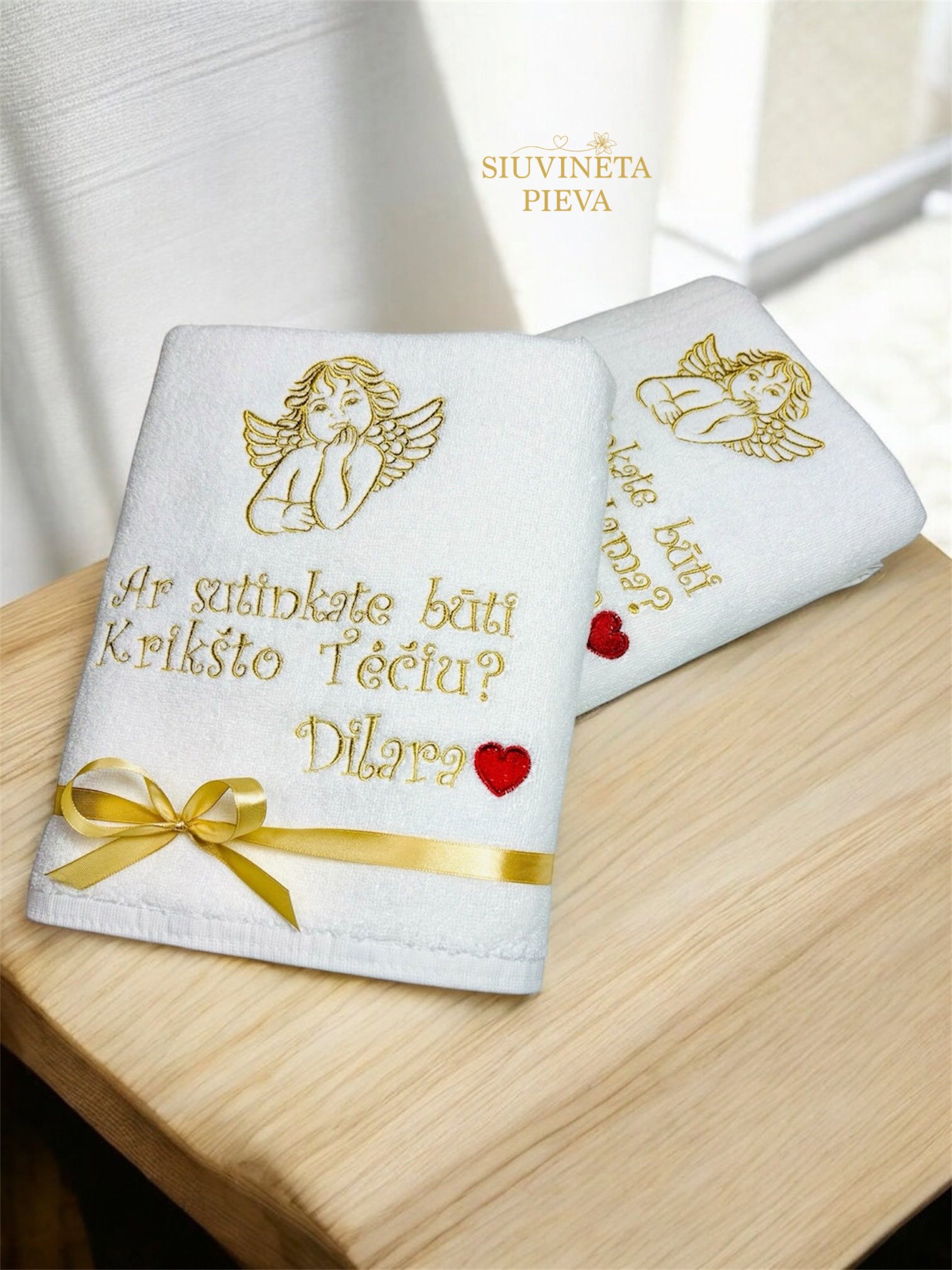 Baltos spalvos rankšluosčiai, išsiuvinėti tekstu - kvietimu Krikšto tėveliams. “Ar sutinkate būti Krikšto Mama? “, “Ar sutinkate būti Krikšto tėčiu?” Ir vaiko vardas su širdele.