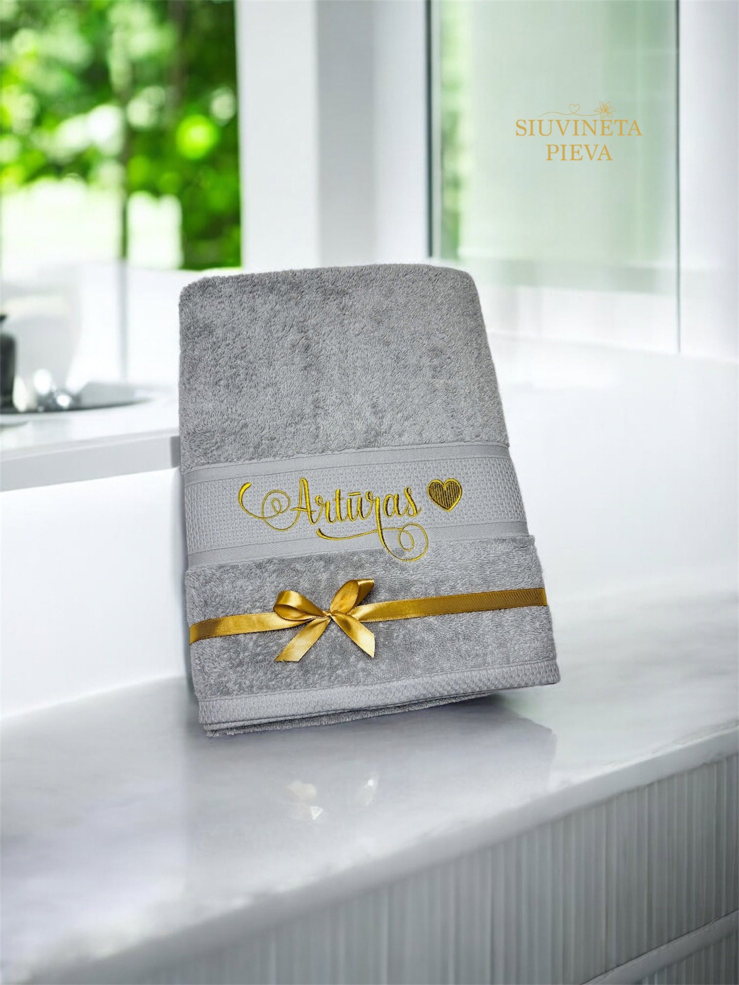 Vonios rankšluostis, išsiuvinėtas Jūsų pasirinktu vardu ir širdele.