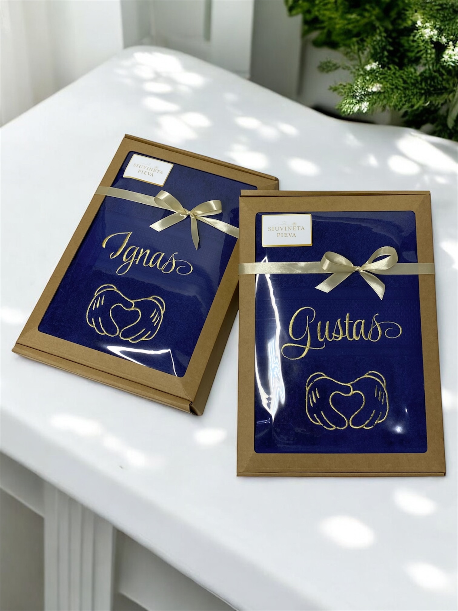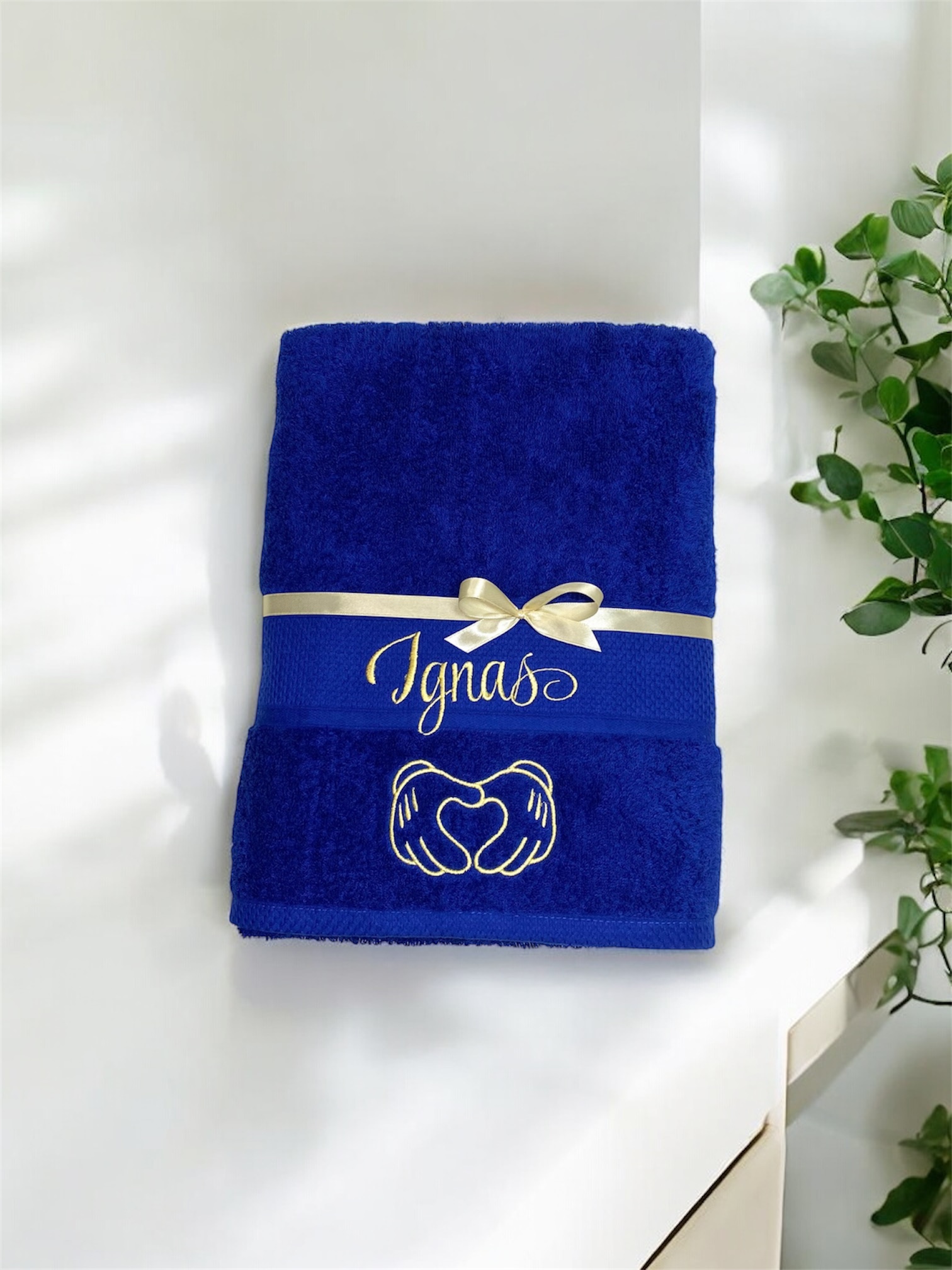Vonios rankšluostis, išsiuvinėtas Jūsų pasirinktu vardu ir rankyčių su širdele dizainu.
