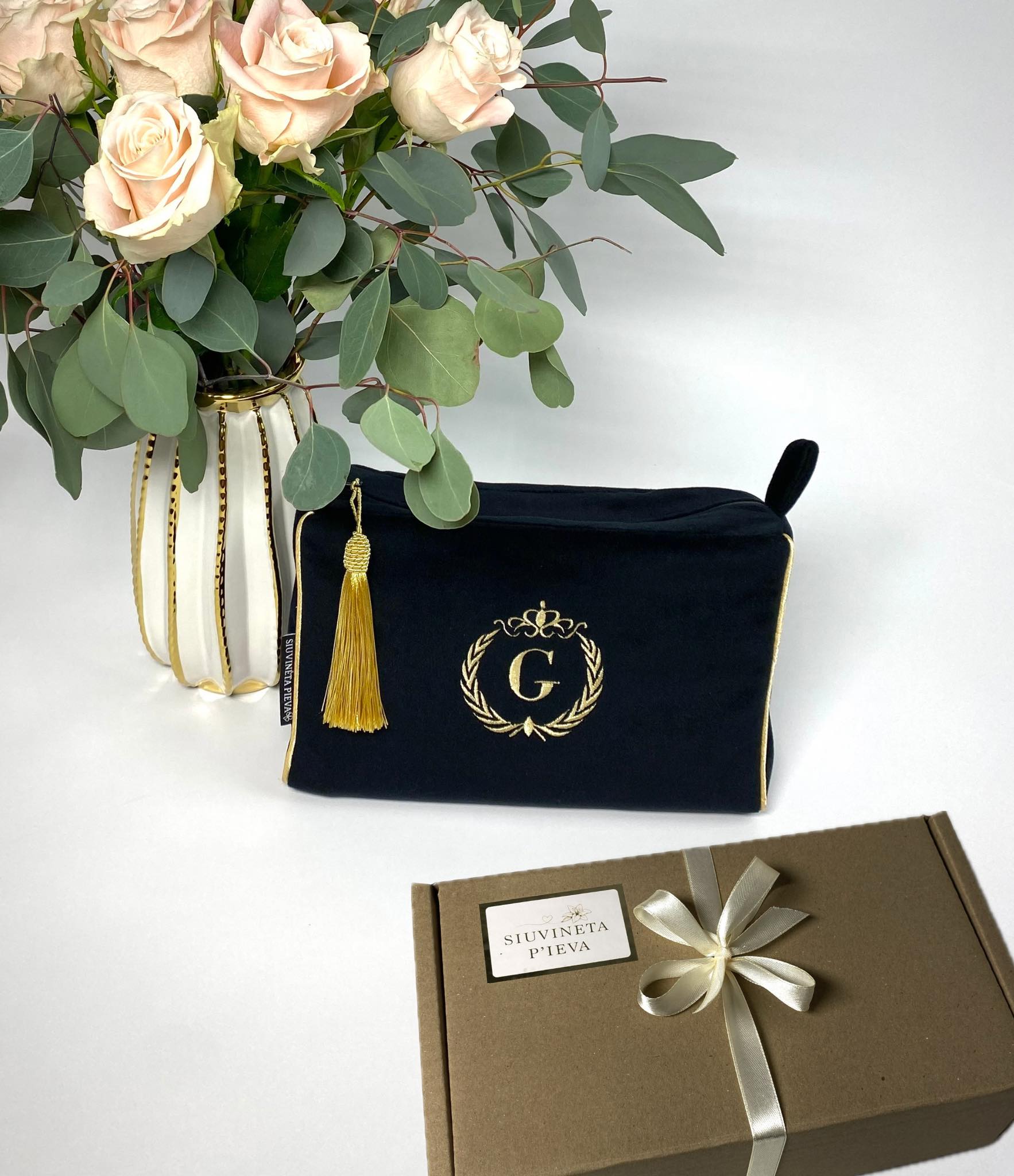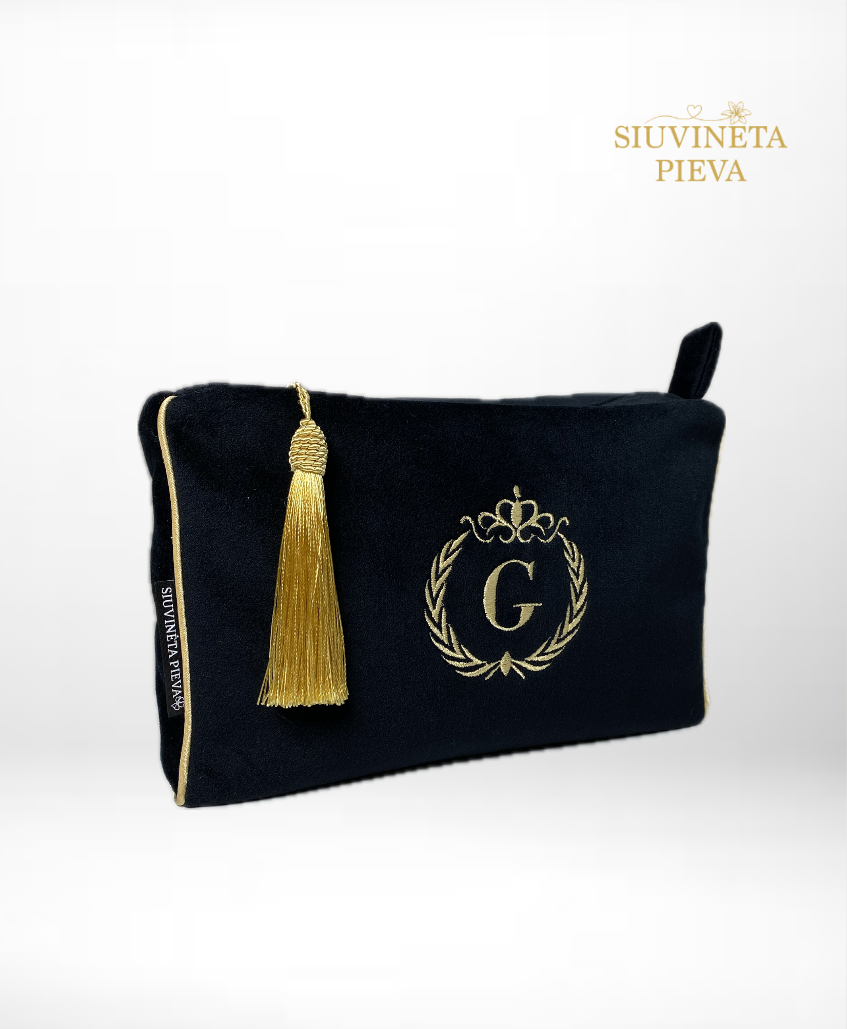 Rankų darbo, juodo veliūro kosmetinė, puošta siuvinėtu inicialu "G" ir kutu.
