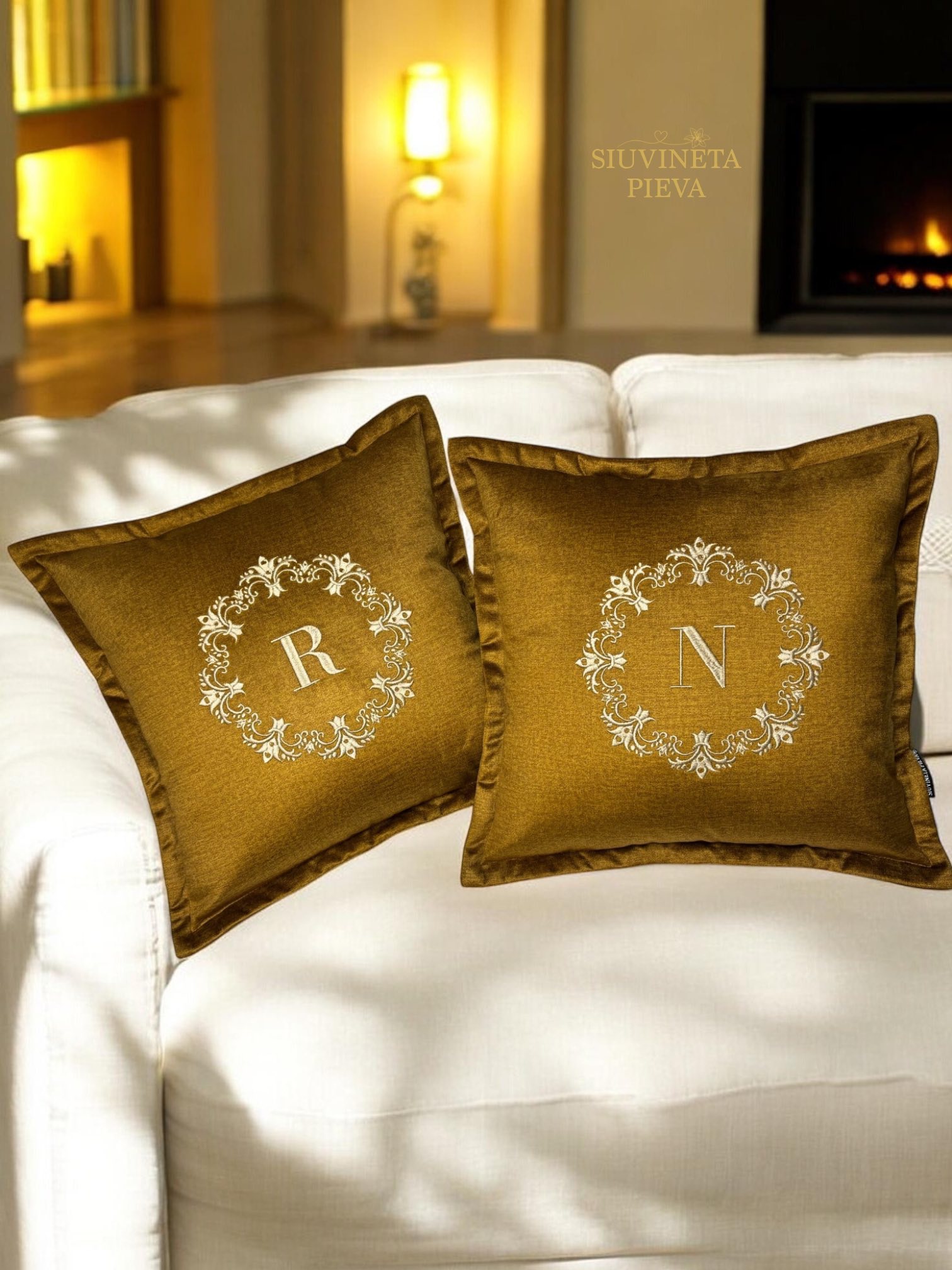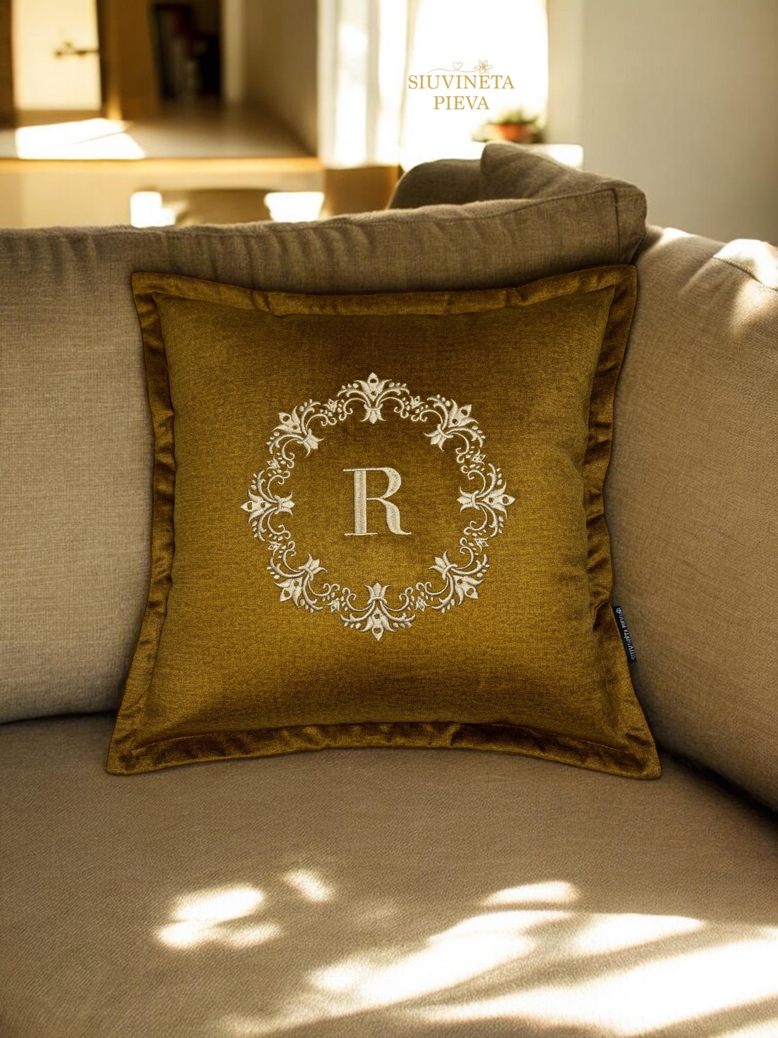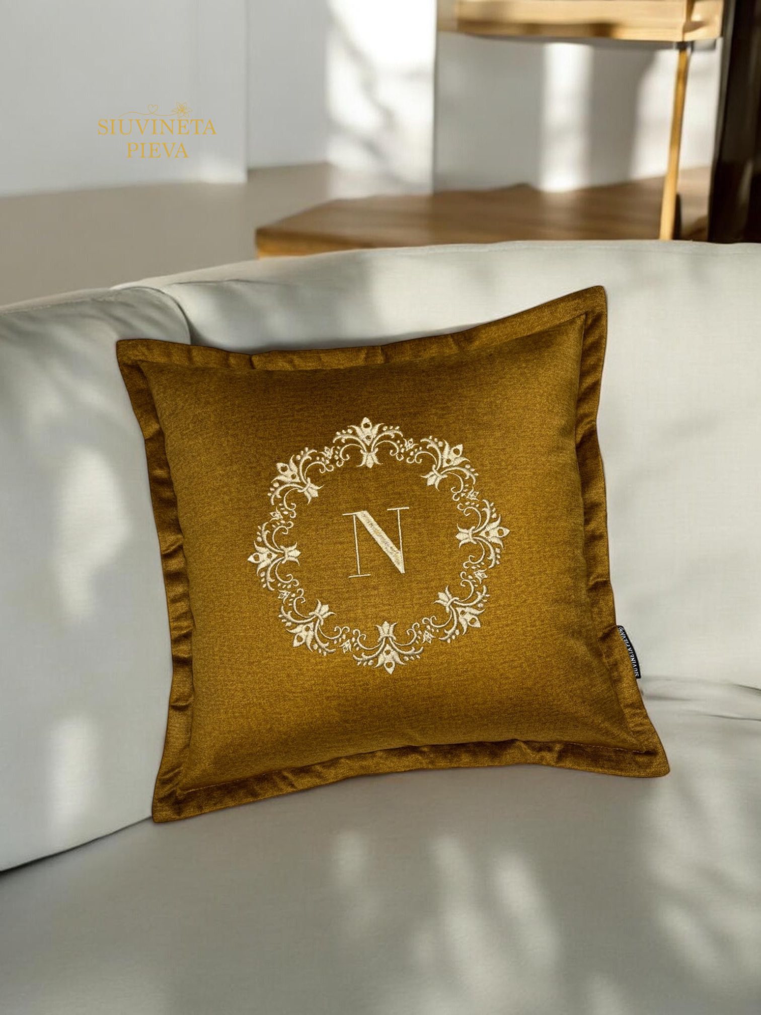 Pagalvėlė, išsiuvinėta pasirinktu inicialu elegantiškame ornamente.