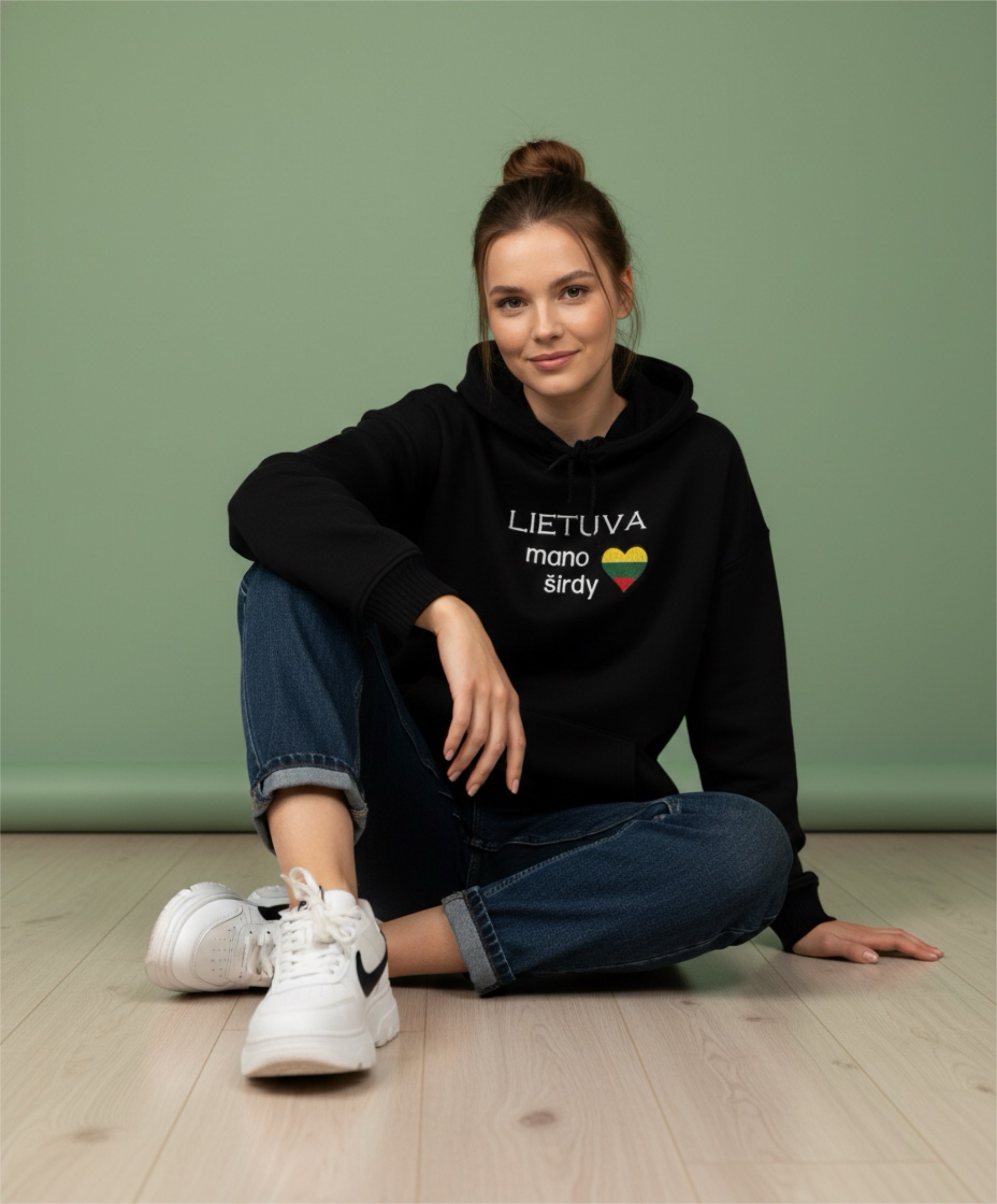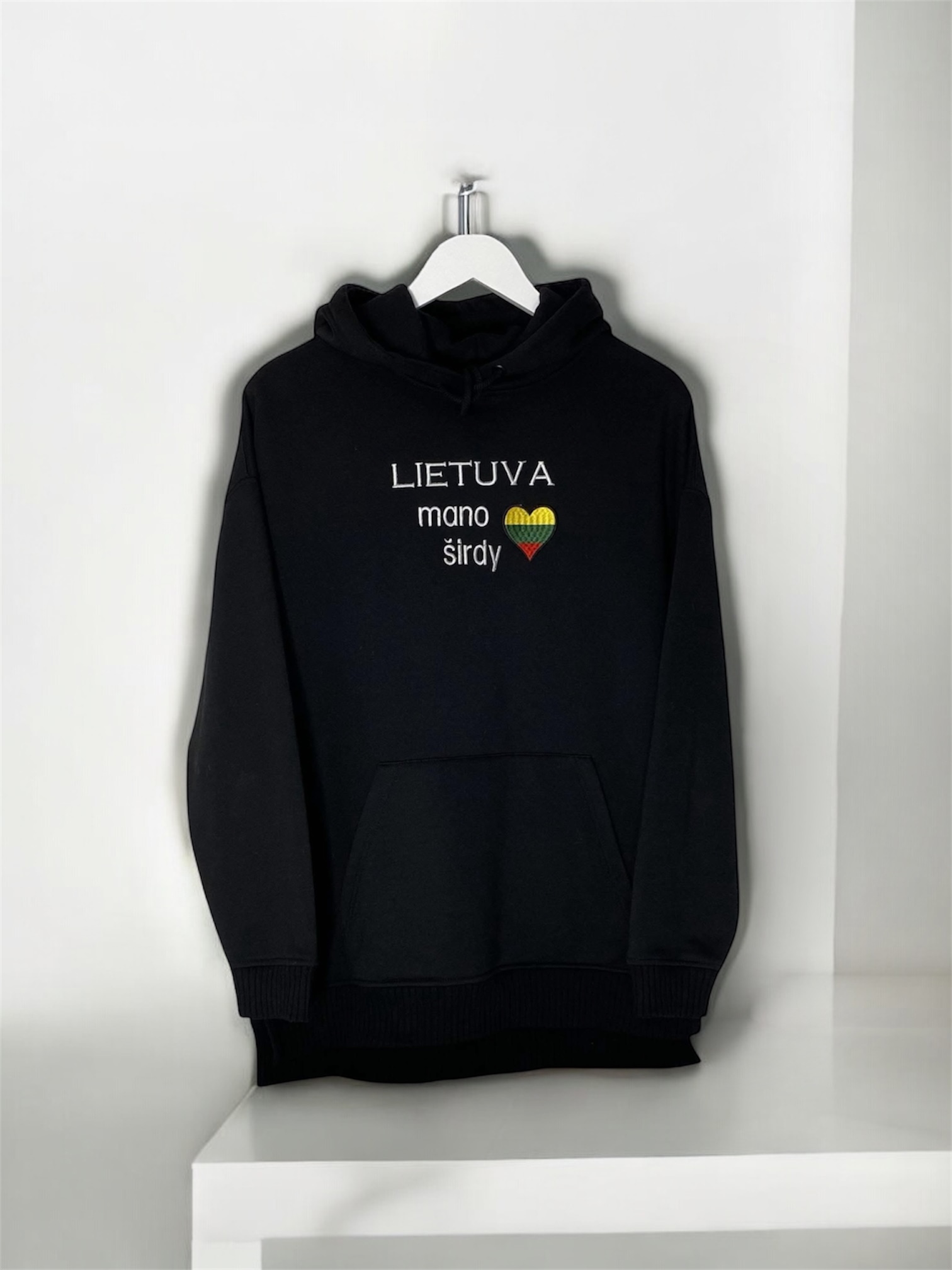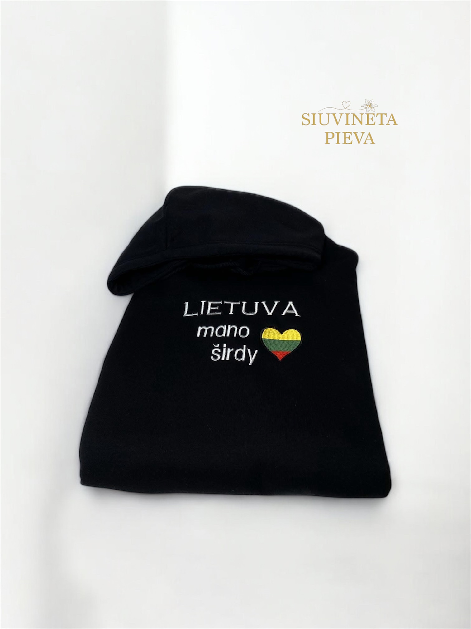 Džemperis, išsiuvinėtas tekstu ant krūtinės - ''Lietuva mano širdy'' ir trispalve širdele.
