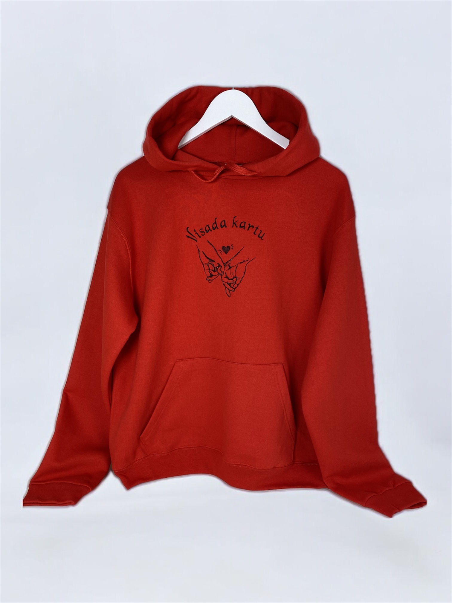 Raudonas unisex džemperis, išsiuvinėtas tekstu "Visada kartu" ir rankų su širdele dizainu. Universalus, todėl tiks tiek moteriai/merginai, tiek vyrui/vaikinui.