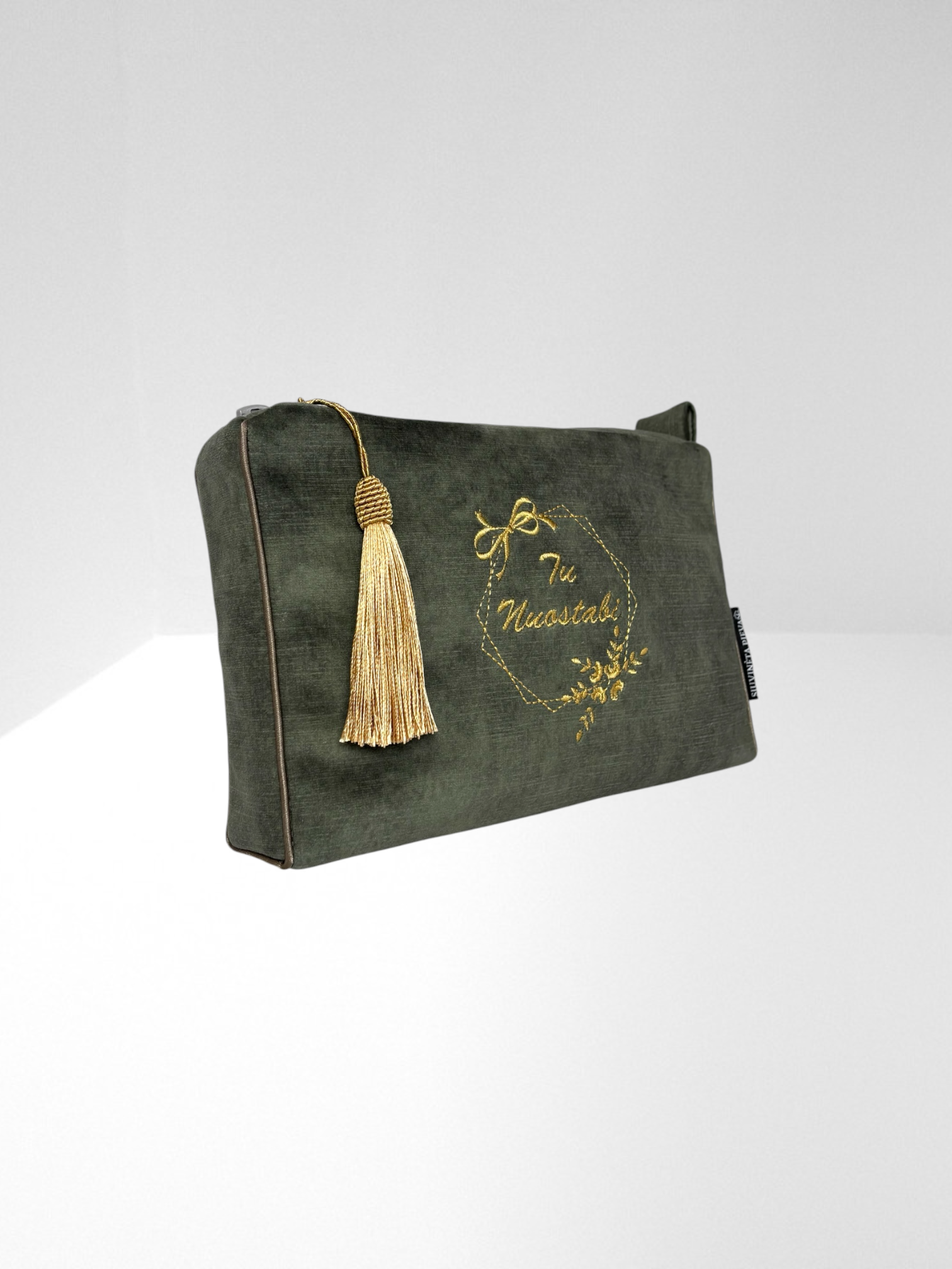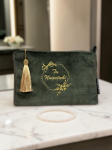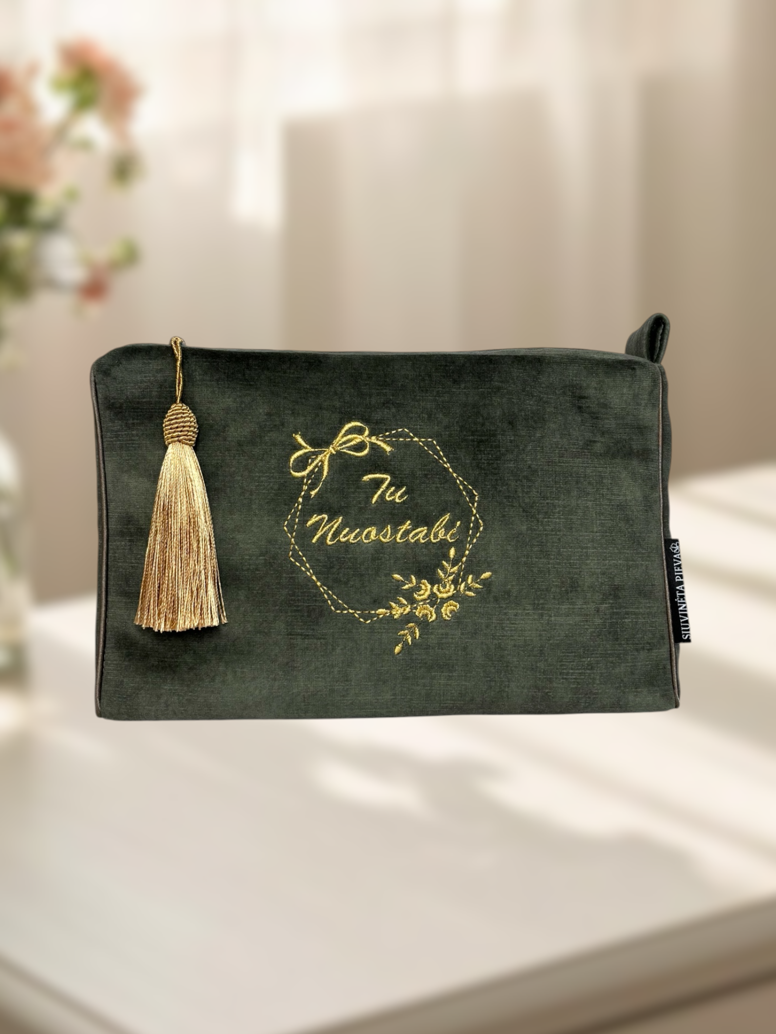 Rankų darbo, nuotaikinga samanų spalvos, tvirto veliūro kosmetinė, išsiuvinėta tekstu "Tu nuostabi", subtiliu ornamentu su gėlių žiedais. Dekoruota kutu. Puikiai tiks tiek moterims, mėgstančioms spalvas ir gyvybingumą, tiek merginoms ar mergaitėms.