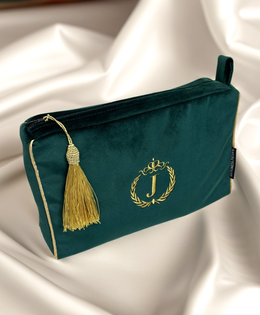 Rankų darbo, žalio veliūro kosmetinė, puošta siuvinėtu inicialu "J" ir kutu.