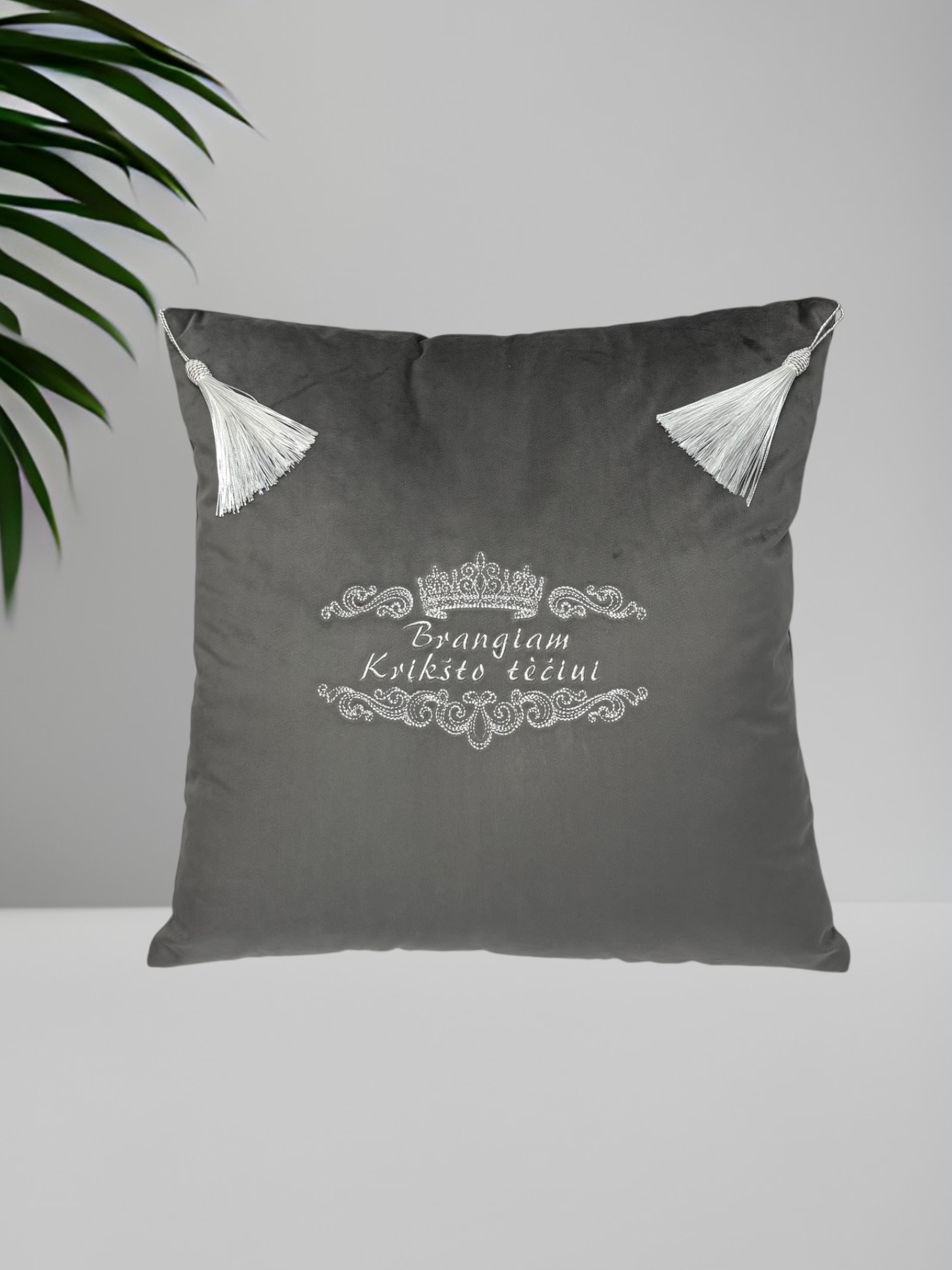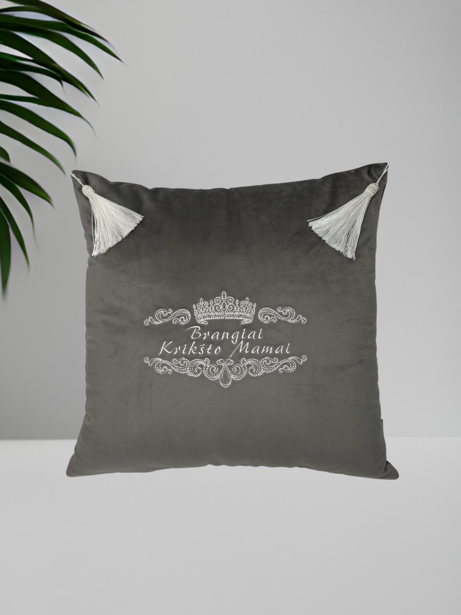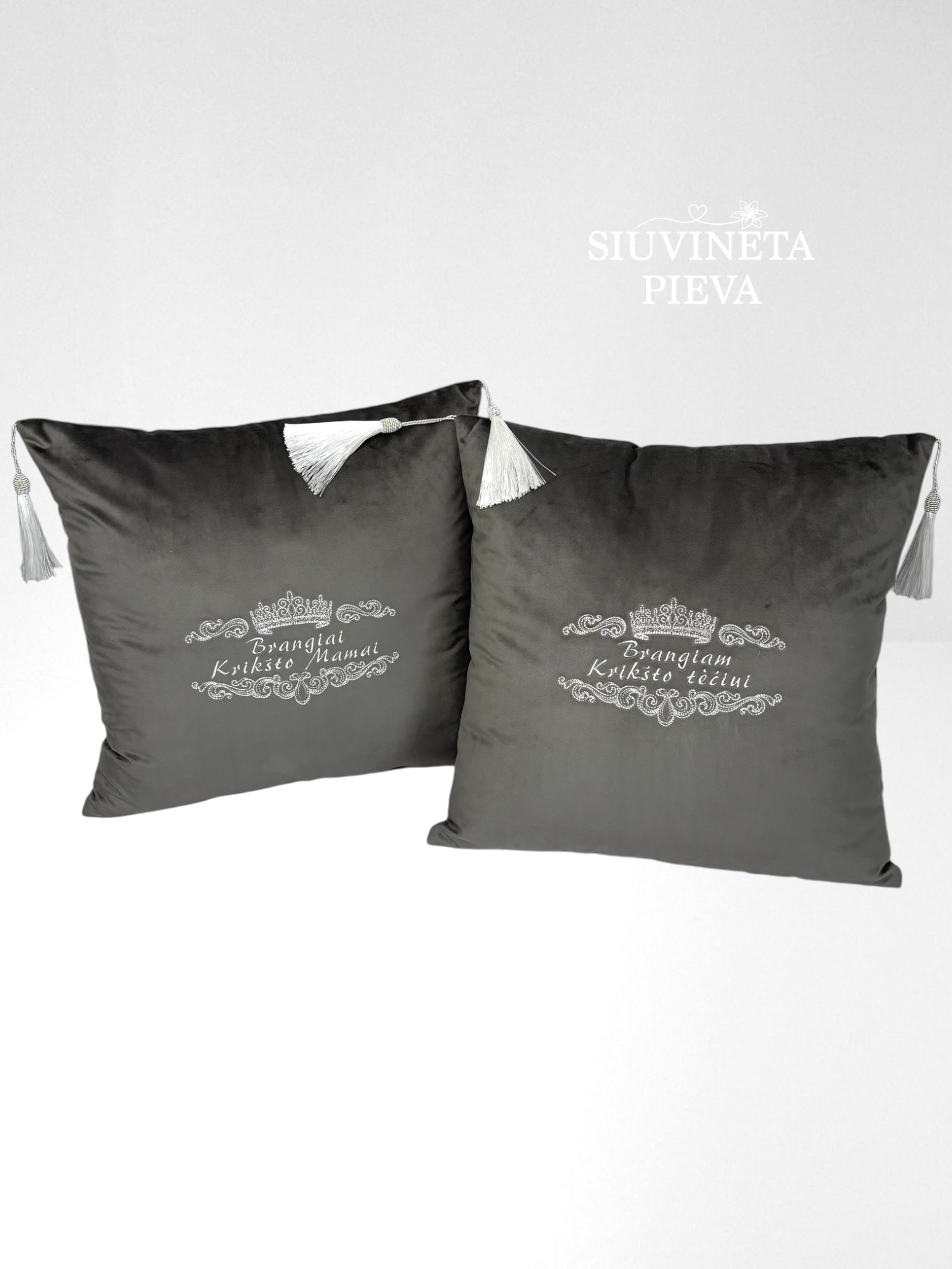 Siuvinėtos pagalvėlės Krikštatėviams. Rankų darbo. Pasiūtos iš tvirto kokybiško pilko baldinio veliūro audinio, kampuose dekoruotos kutais. Išsiuvinėtos sidabriniais siūlais, subtiliu ornamentu ir užrašu "Brangiai krikšto mamytei" ir "Brangiam krikšto tėveliui".