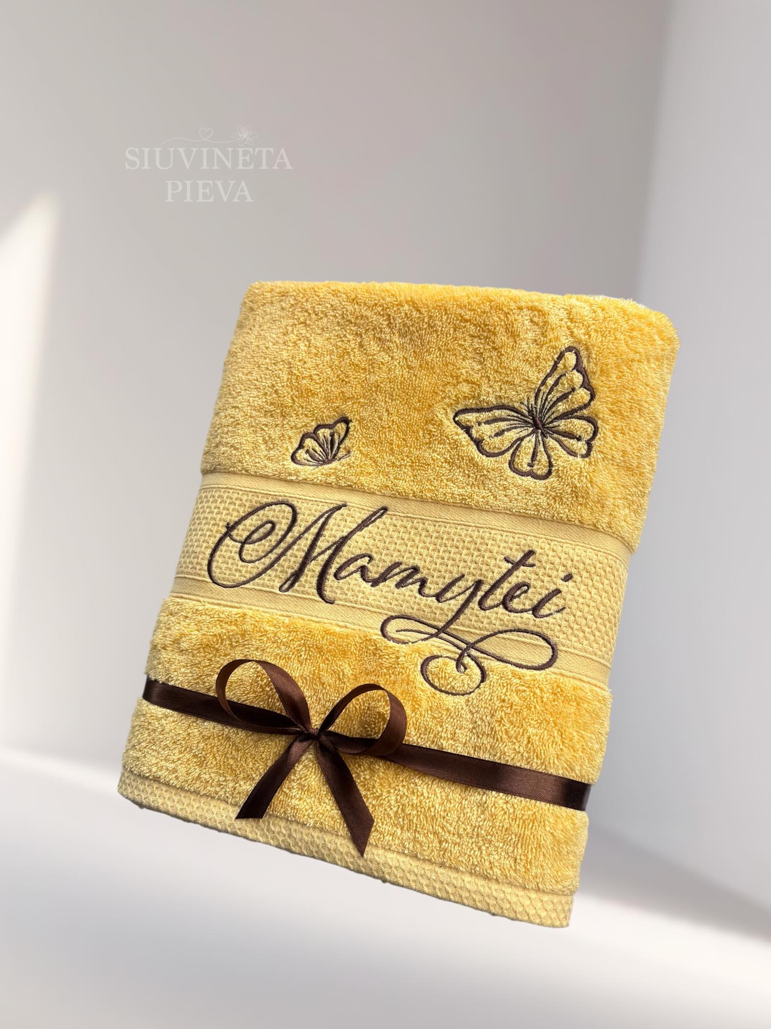 Šiltos geltonos spalvos rankšluostis, išsiuvinėtas tekstu "Mamytei" ir drugeliais. Jauki ir praktiška dovana mamai. Lengvas ir mielas išsiuvinėtas dizainas suteiks lengvumo kasdieniams vonios ritualams.