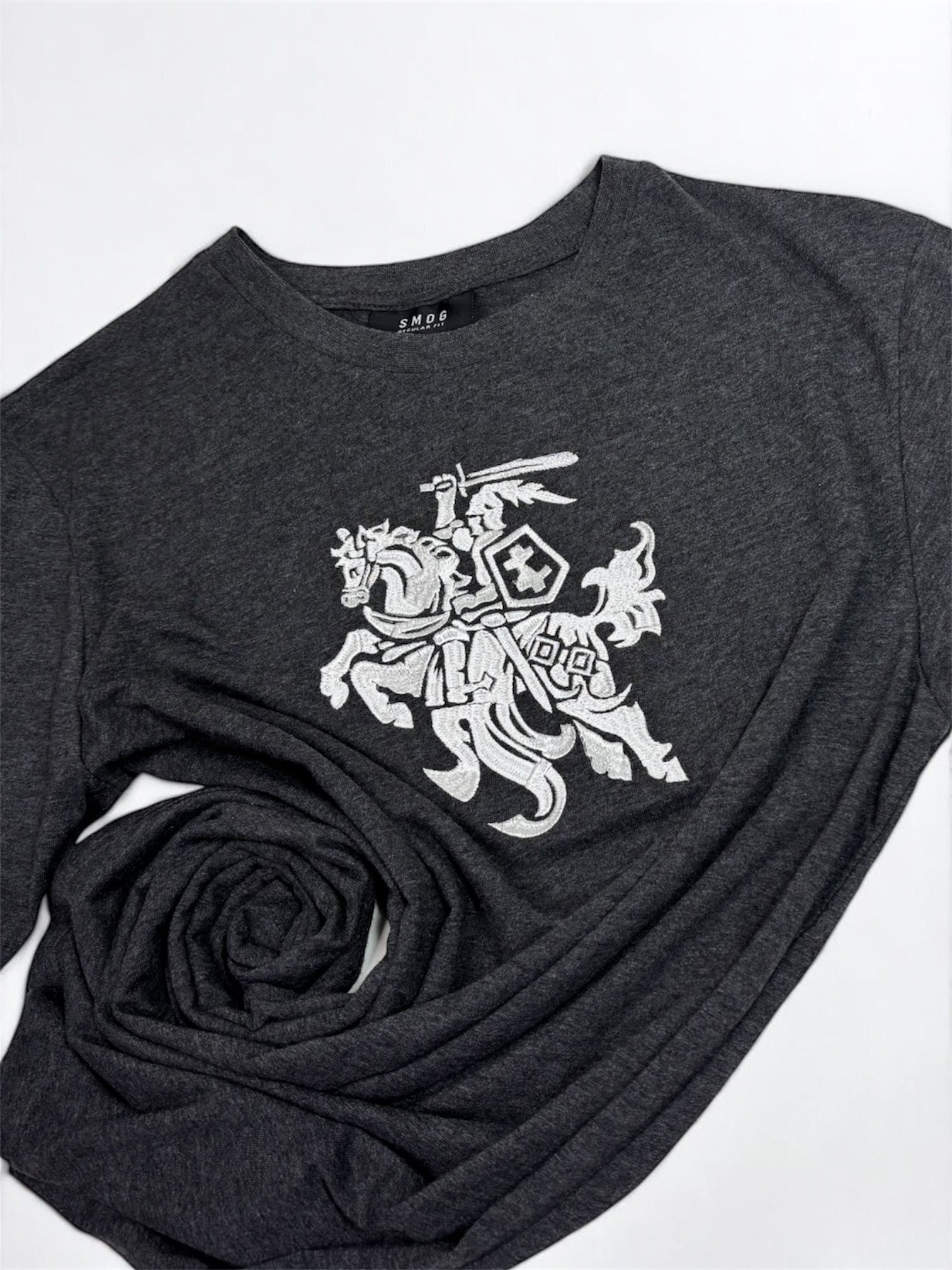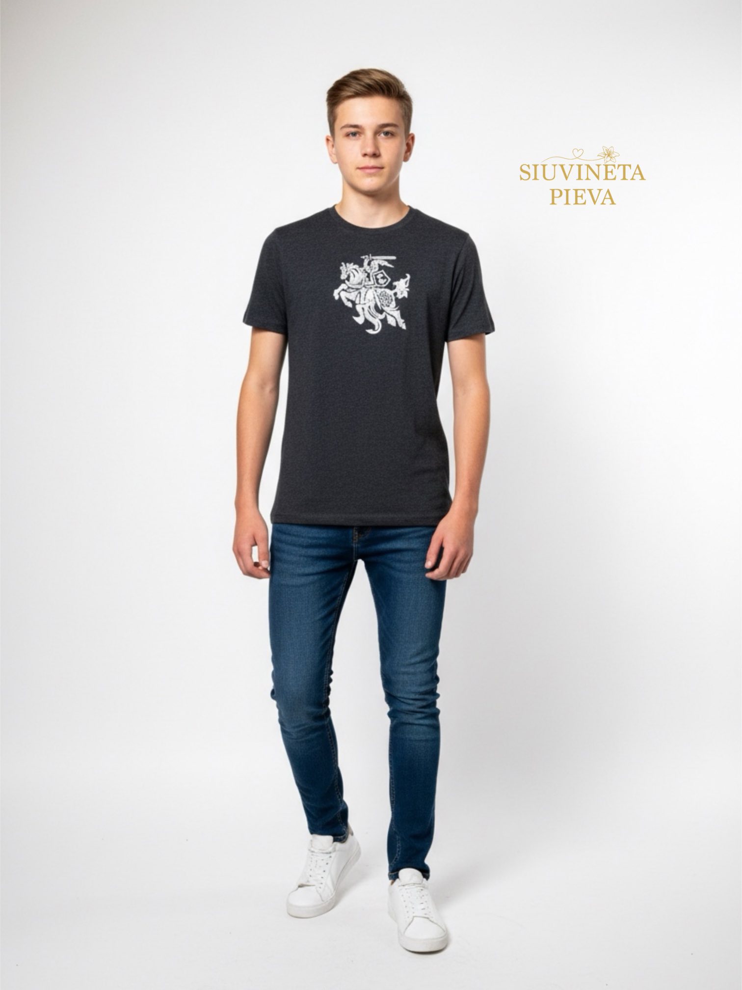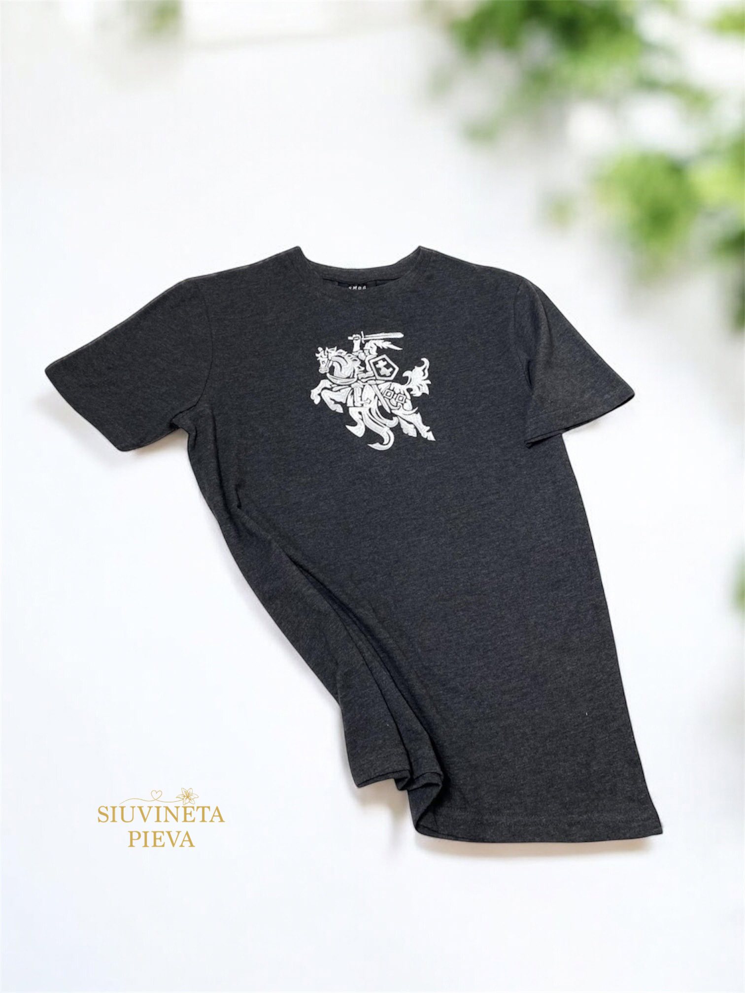 Pilkos spalvos siuvinėti marškinėliai trumpomis rankovėmis. Baltais siūlais išsiuvinėtas Vytis.