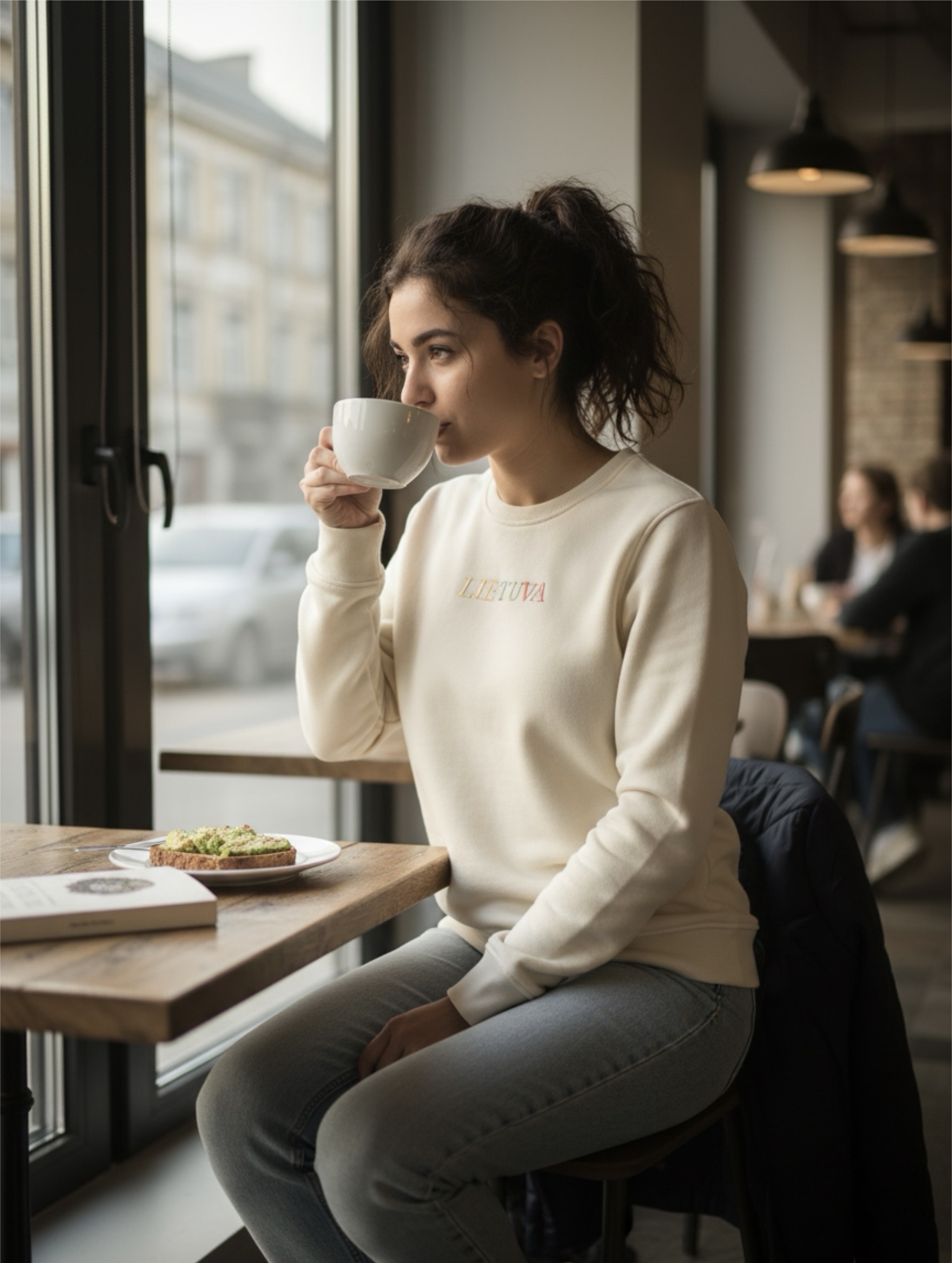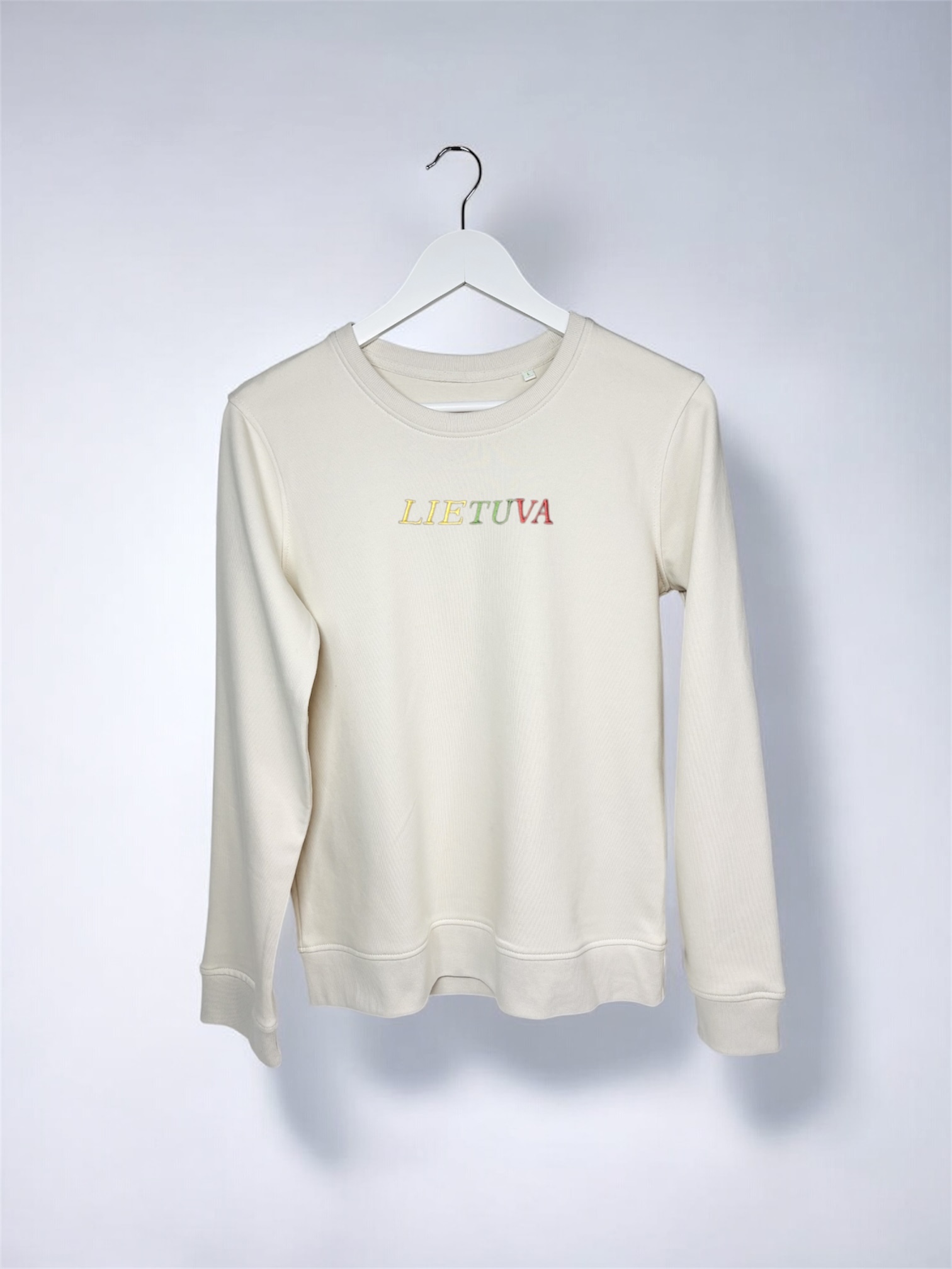 Šviesus, aukštos kokybės moteriškas džemperis be gobtuvo, išsiuvinėtas tekstu ''Lietuva'', Lietuvos trispalvės spalvomis.
